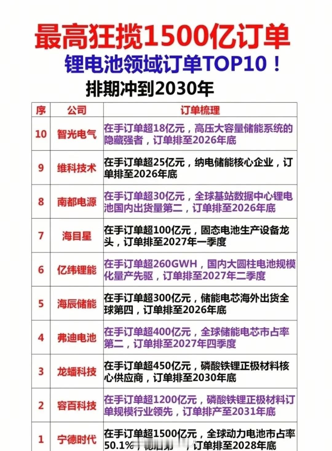 锂电池领域订单TOP10!最高狂揽1500亿,排期冲到2030年!从宁德时代的1500亿订单稳居行业第一,到容百科技、龙蟠科技的千亿级、百亿级订单,再到储能、钠电、设备等细分赛道的企业,排期直接排到2027、2030年!