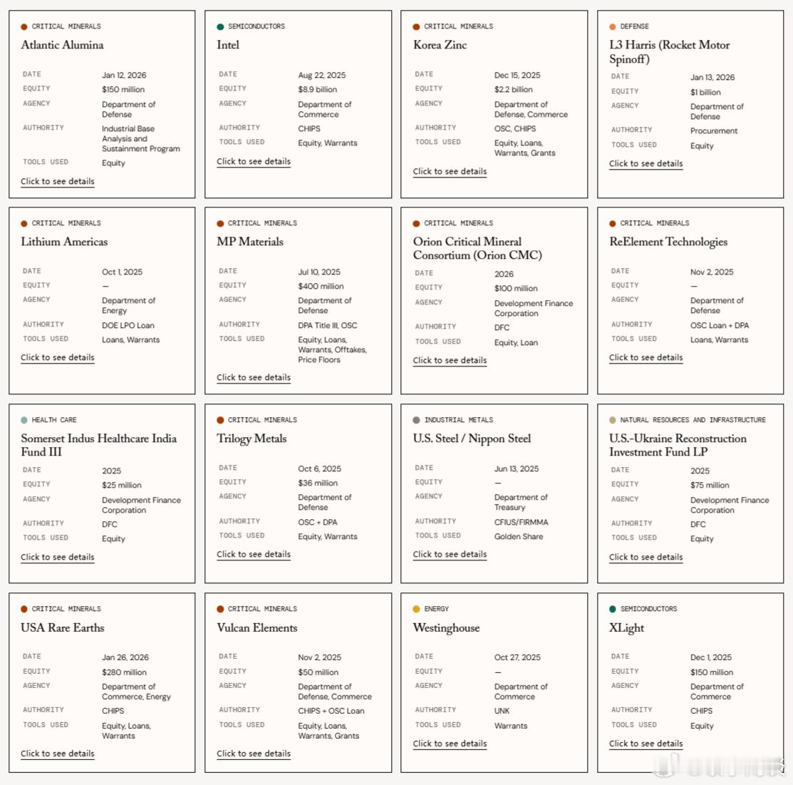 美国外交关系委员会(CFR)的“美国政府交易追踪器”旨在揭示公共部门对私营企业日益增长的投资情况。该追踪器利用公开信息,展示了自2025年1月以来宣布的涉及股权和准股权的交易信息。它记录了每笔交易的关键细节,包括达成的条款、涉及的机构和部门、私营部门和外国合作伙伴的参与情况,以及用于监测进展的里程碑。