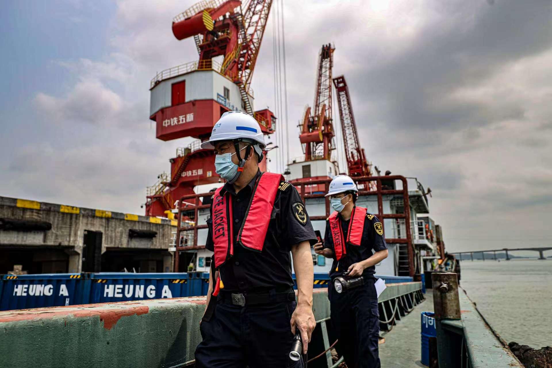 佛山海关驻顺德办事处关员开展船舶登临作业。