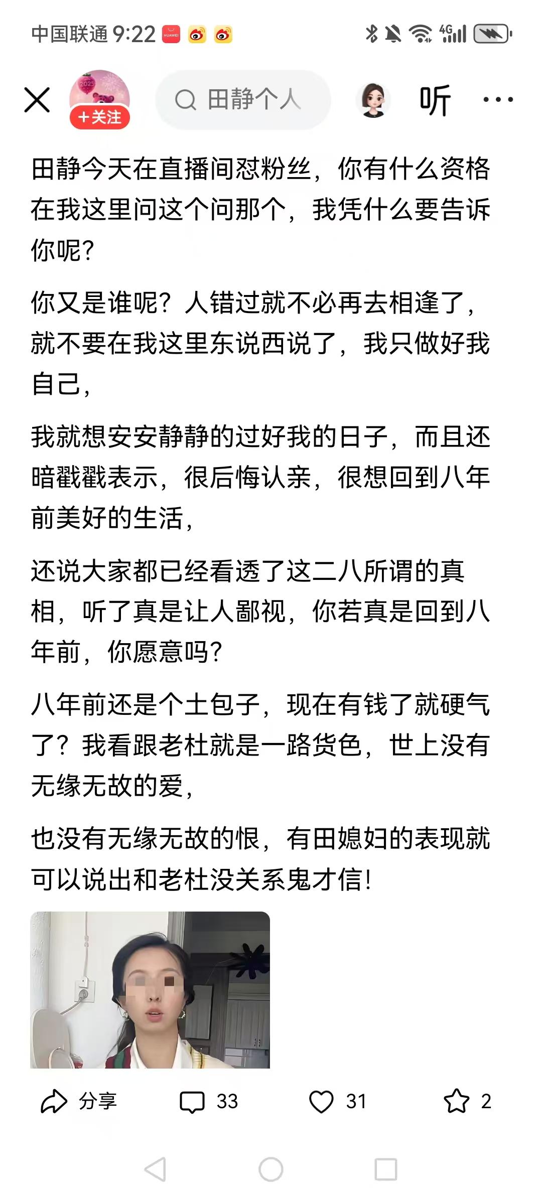 田静今天在直播间怼粉丝,有没有资格片说了不算,她不出来网上谁都不管她,既然上网,就应接受网民各种话题。