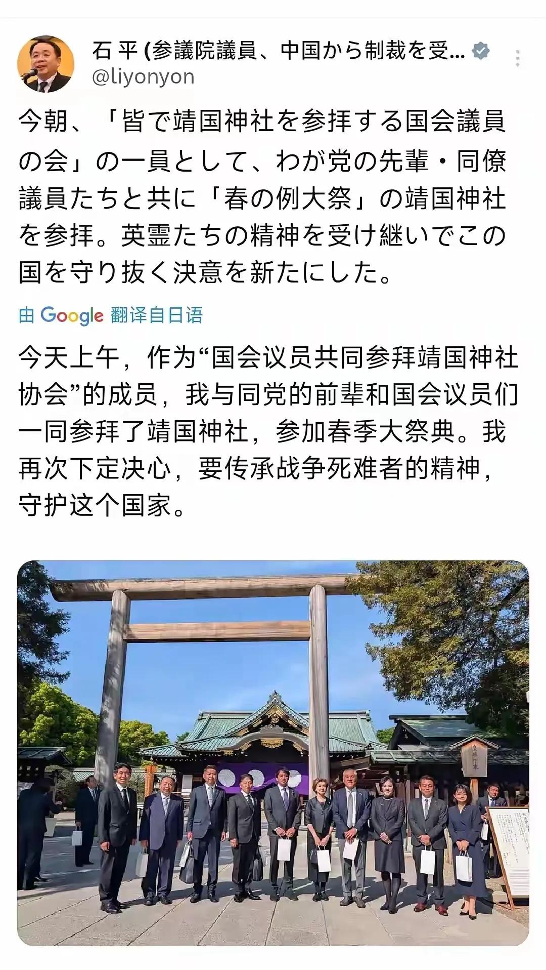 被称为当代最大汉奸的石平太郎在社交网站发帖,称自己在4月22日参拜了靖国神社,参