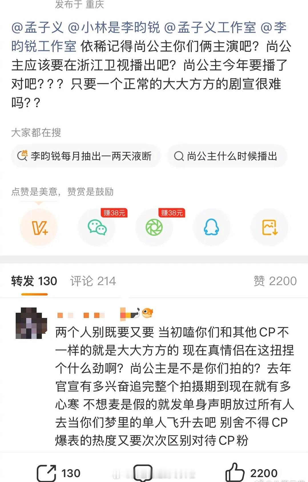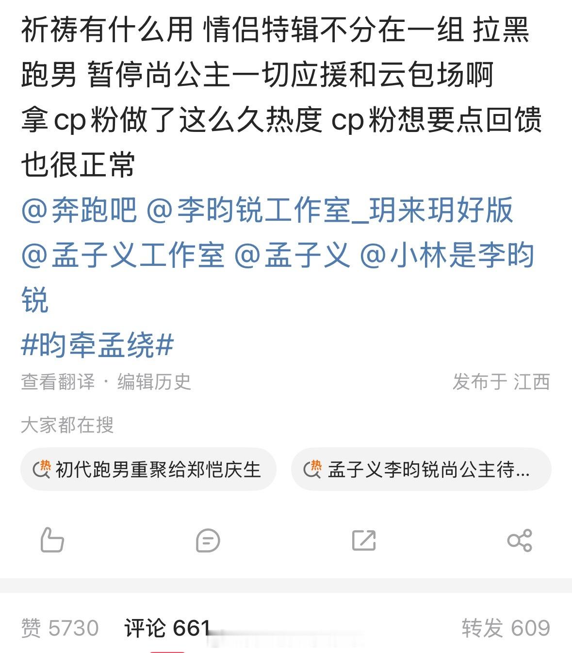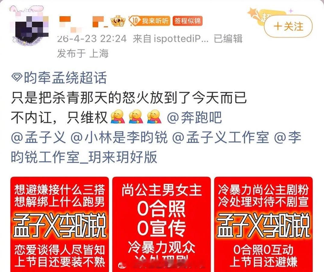 有人曝孟子义和李昀锐在跑男上避嫌装不熟,加上《尚公主》宣传冷处理,所以昀牵孟绕c