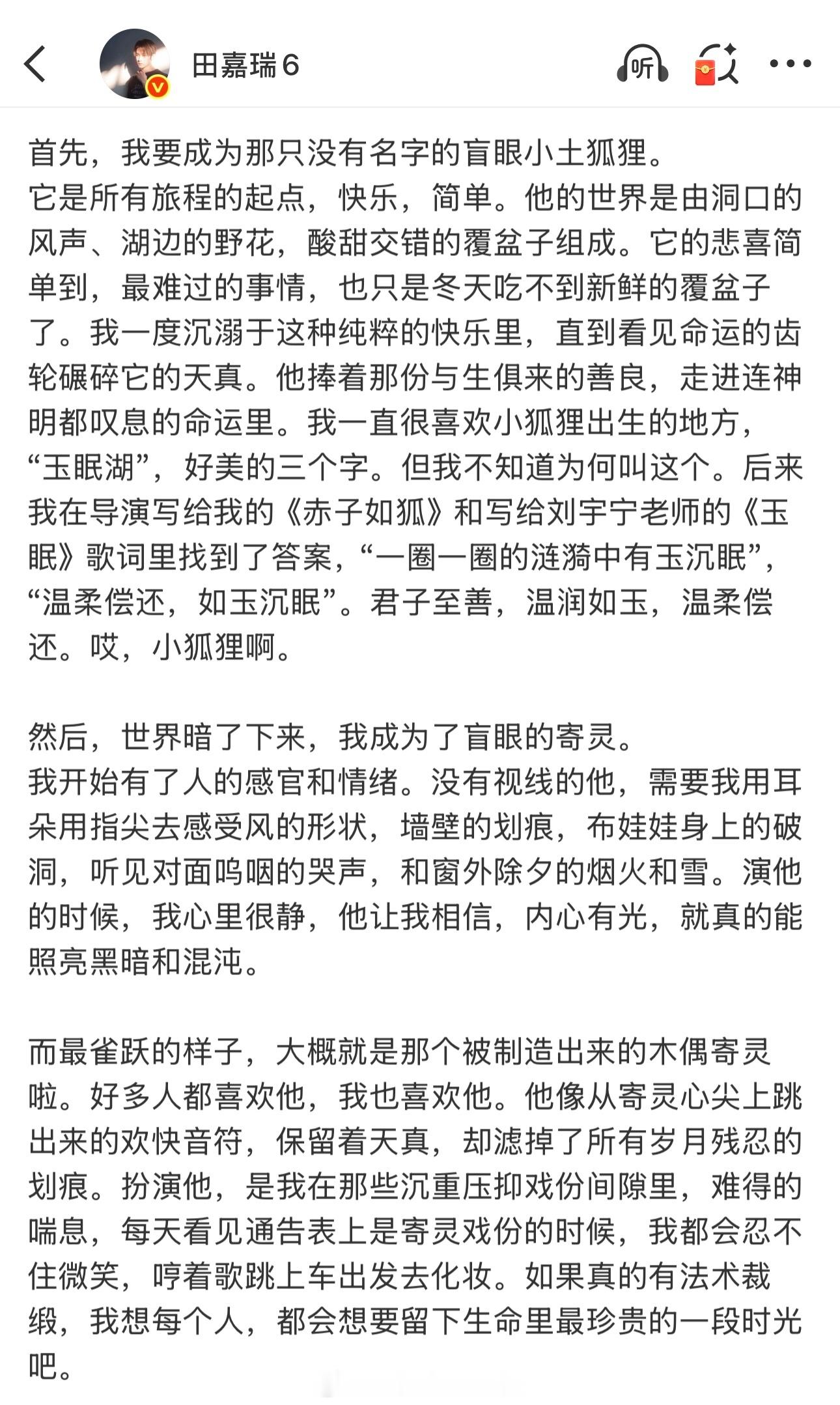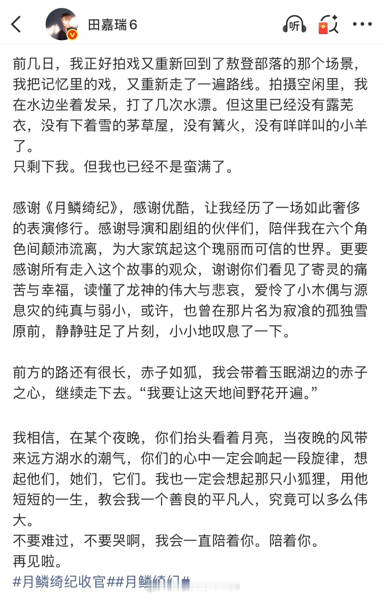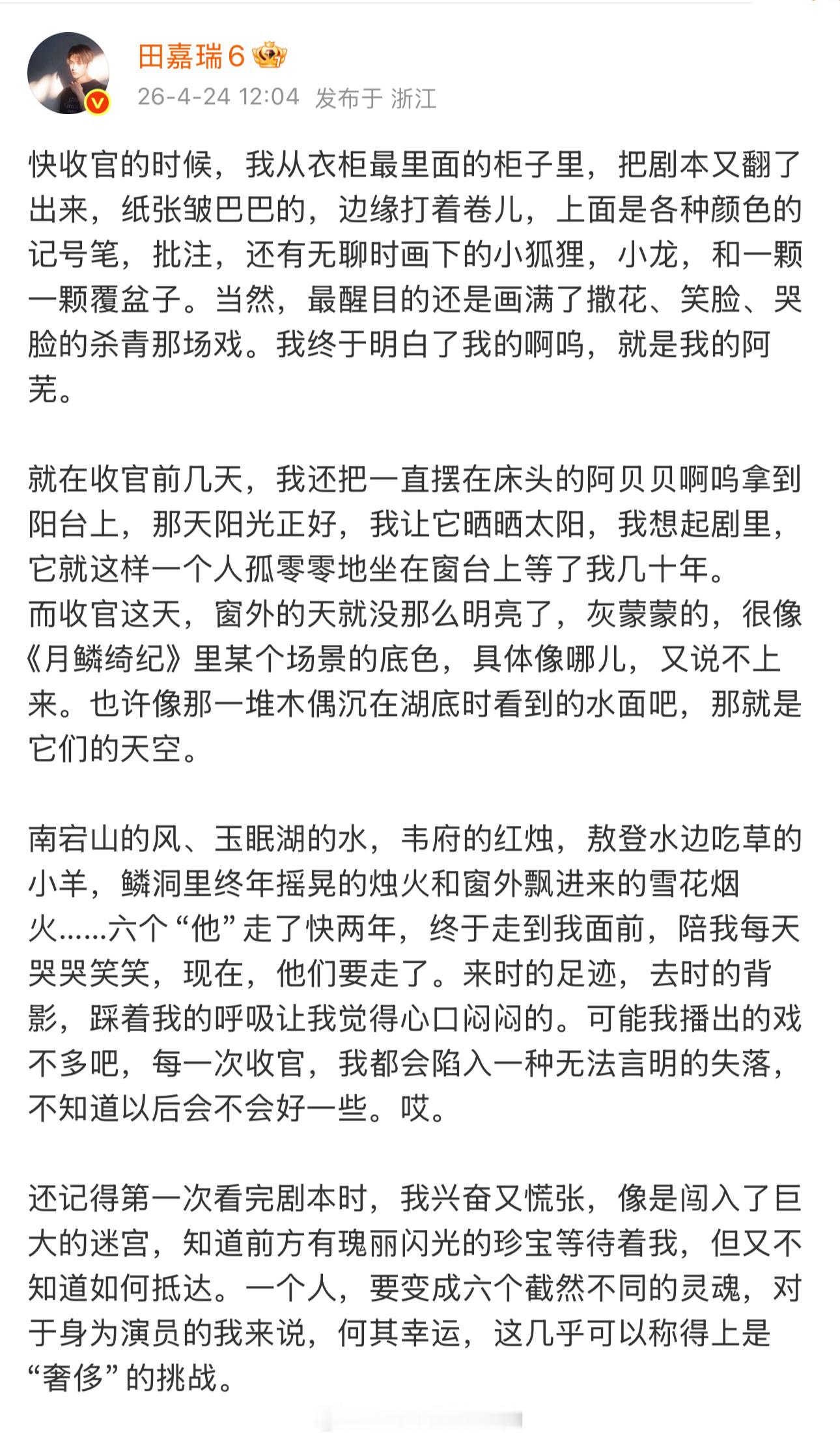 田嘉瑞《月鳞绮纪》收官小作文大概是我看过的演员收官小作文里,写的最多最丰富对角色爱的最深的一位演员了,好本子和好角色可以多给到好演员了田嘉瑞田嘉瑞