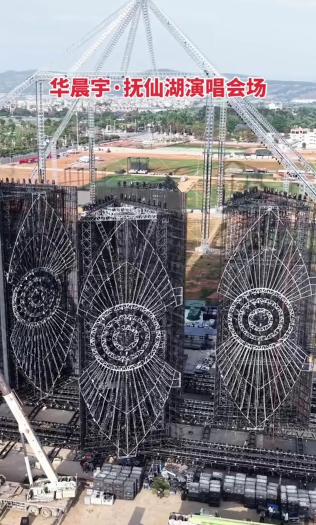近20层楼高的巨型舞台和360度环幕已搭好,灯光都调试好了,却因不可抗力,多部门审批没通过叫停,现已拆除。