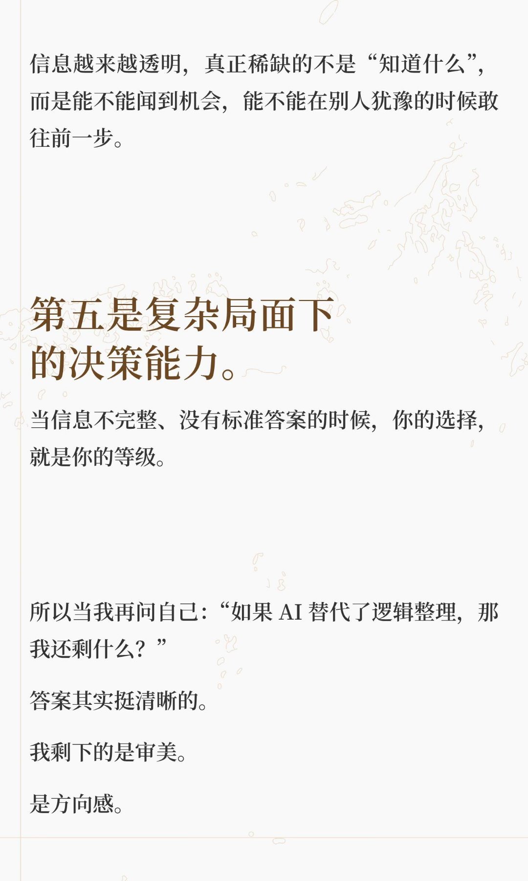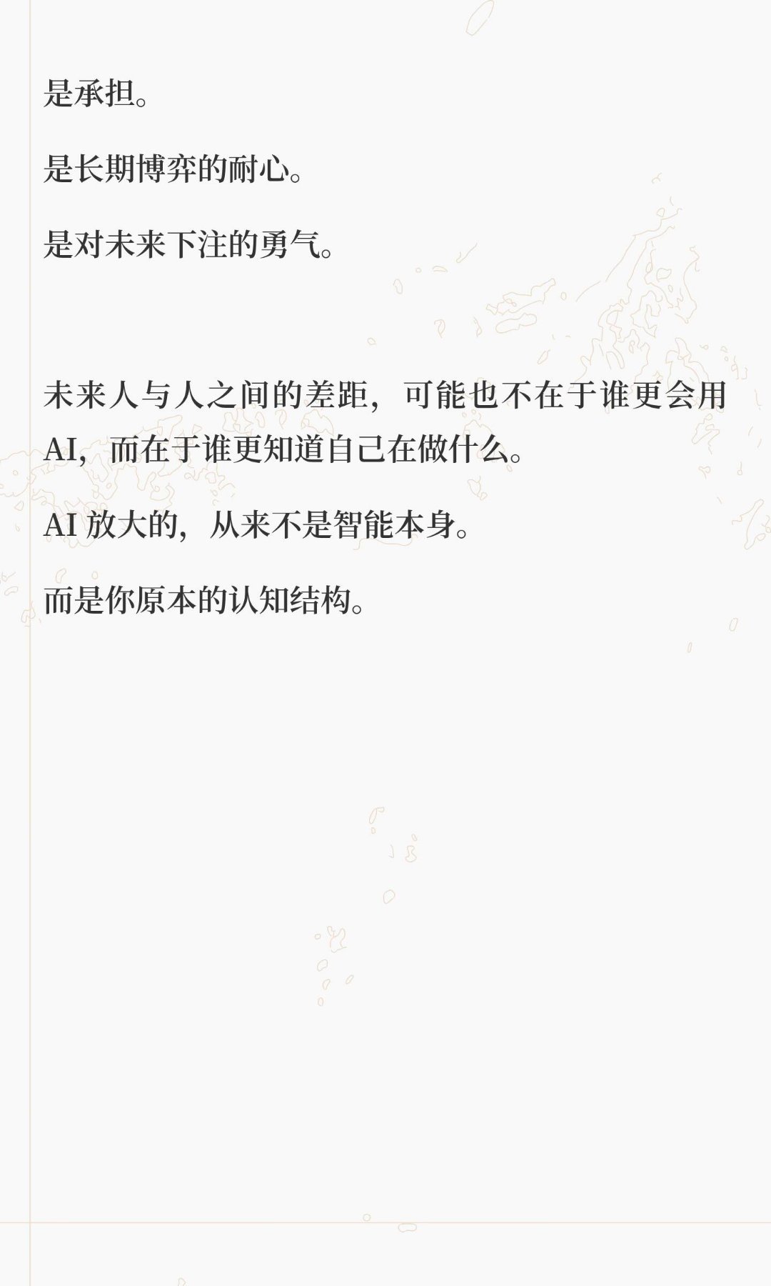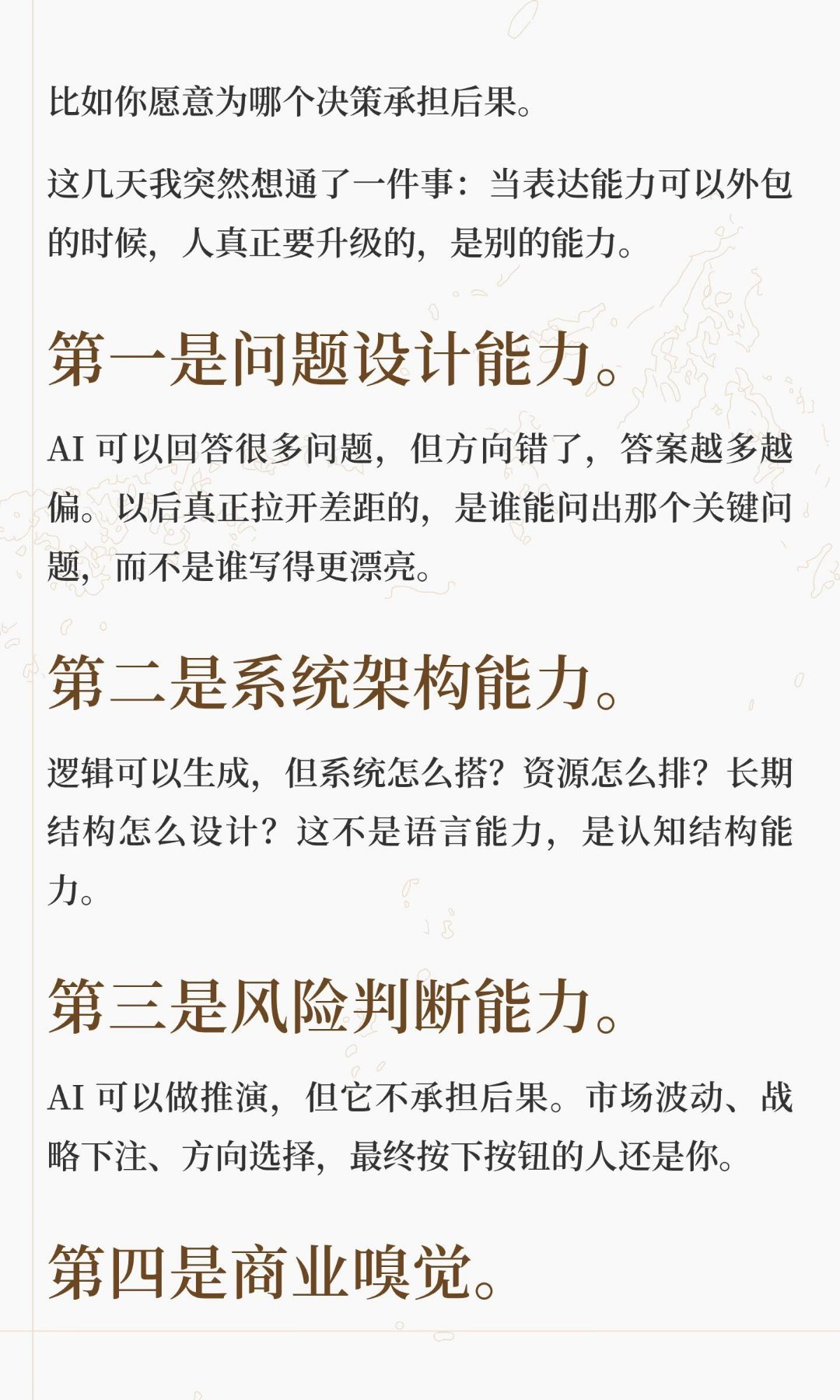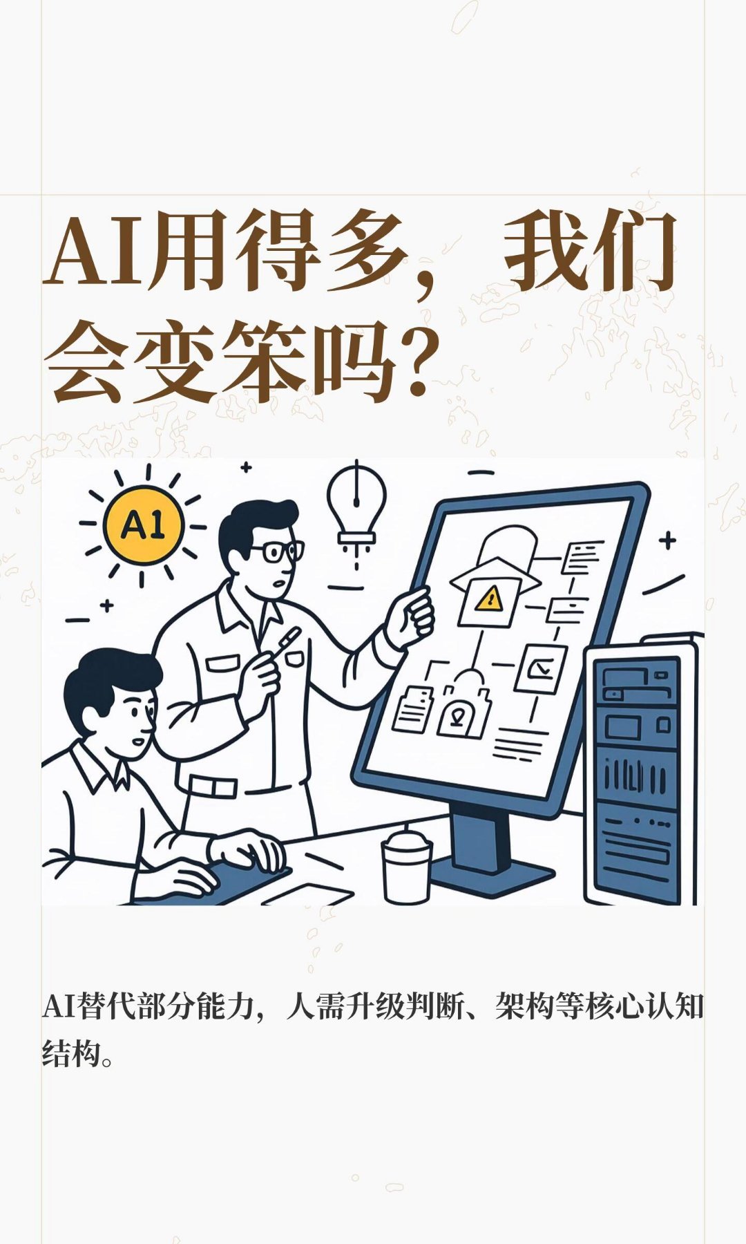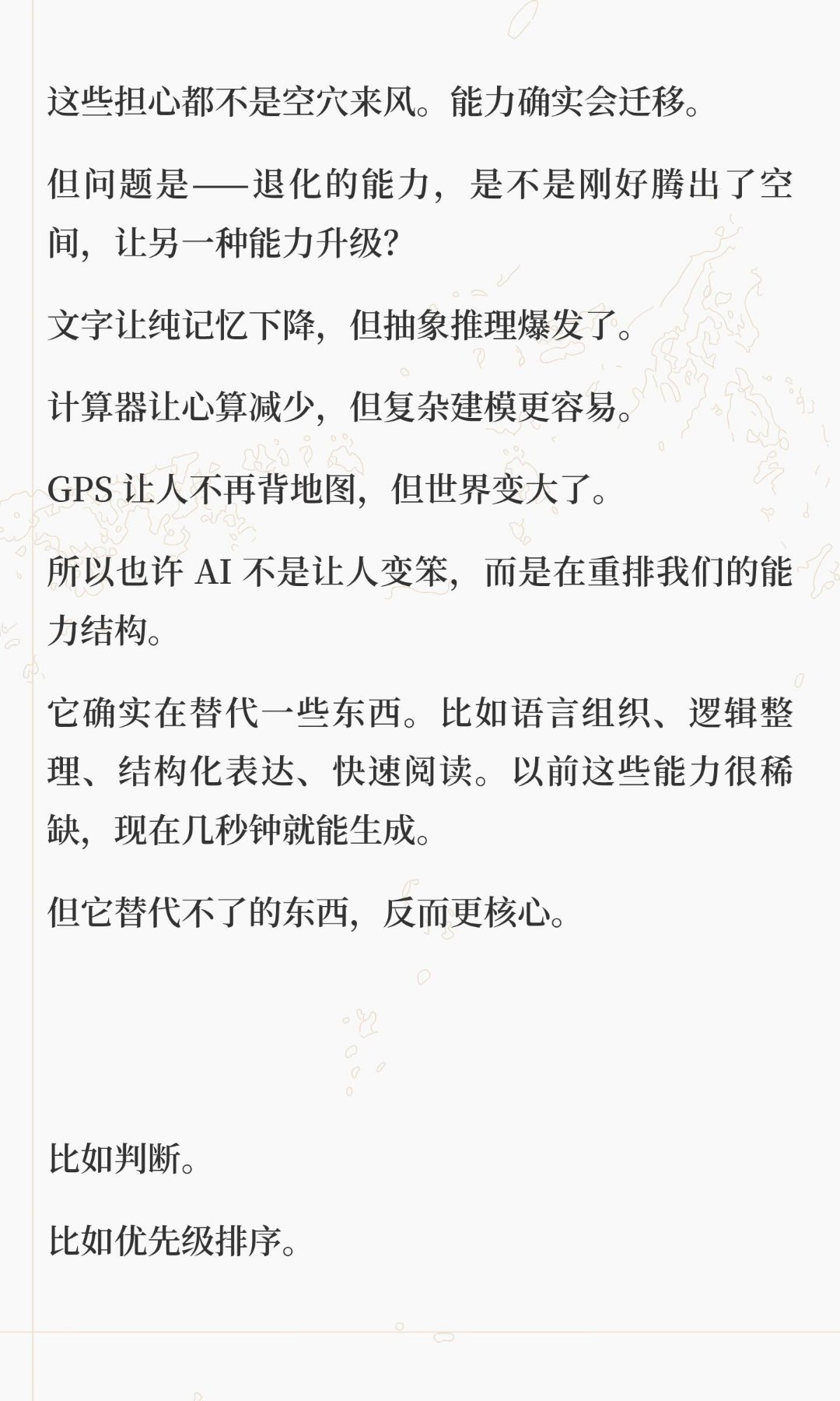 警惕AI对大脑认知的负面影响 最近和 AI 打交道越多,我反而越来越确定一件事:人不会因为 AI 变笨。 但会因为停止思考而变浅。技术每一次升级,都会替代一部分能力。 文字替代记忆,计算器替代算术,GPS 替代方向感。 能力会迁移,但不会消失。这次 AI 替代的是表达、结构、执行层。 那人要升级的,就是判断、取舍、方向感。当答案变得廉价,决定做什么,反而变得更稀缺。AI用多了真的会降智吗