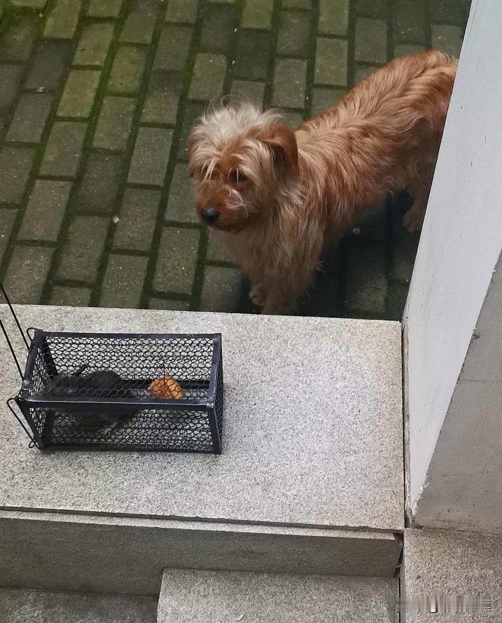 我看见那么大一满锅开水,我怕老公不小心摔跤烫伤了自己,要求倒出一些来,这犟牛就是不干。我拎着老鼠笼先下去了,在门口等他,我把老鼠笼放门口,一个小狗走过来凑近看老鼠,但没有想吃掉老鼠的意思,我就围着老鼠拍视频和照片。而且不停地看老公出家门没有,我好给他开单元的大门,我怕他出事情。我一会拍照,一会看老公,就在门口的几级台阶上上下下,一不小心,自己摔了一跤。