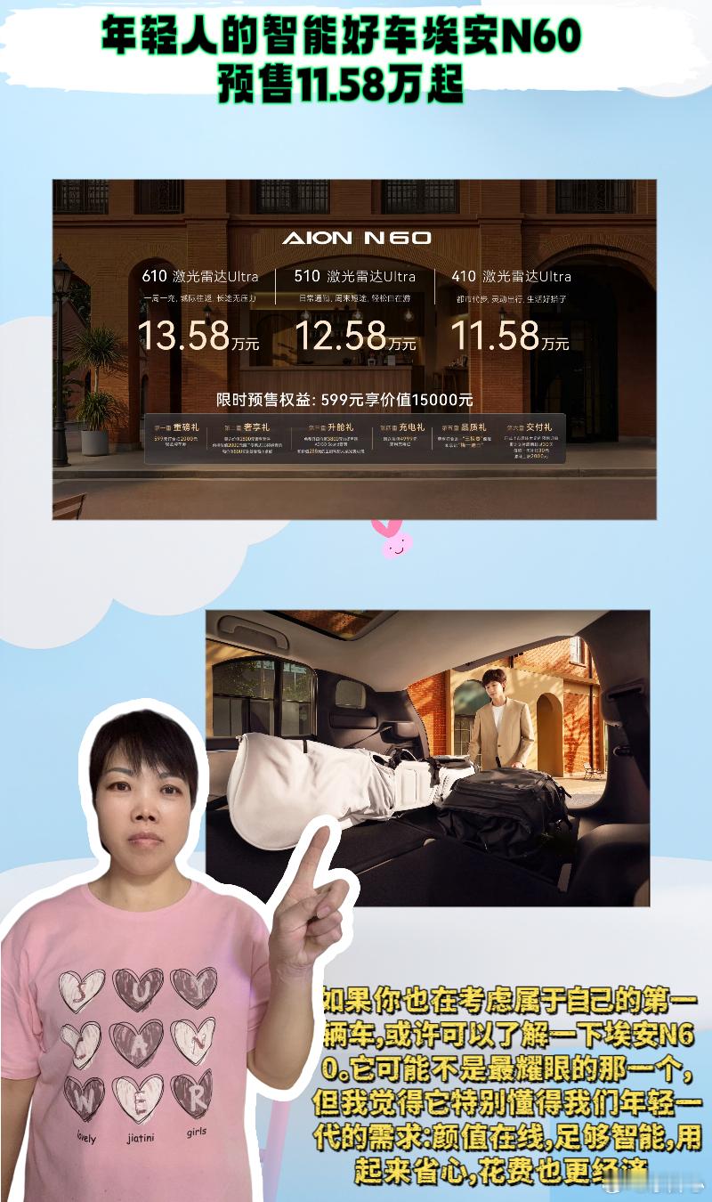 💖如果你也在考虑属于自己的第一辆车,或许可以了解一下埃安N60。它可能不是最耀眼的那一个,但我觉得它特别懂得我们年轻一代的需求:颜值在线,足够智能,用起来省心,花费也更经济。就像一个可靠的朋友,安静地陪着你,去探索更远的路,遇见更多的风景。这段有它陪伴的旅程,让我对未来的每一天,都多了几分期待。