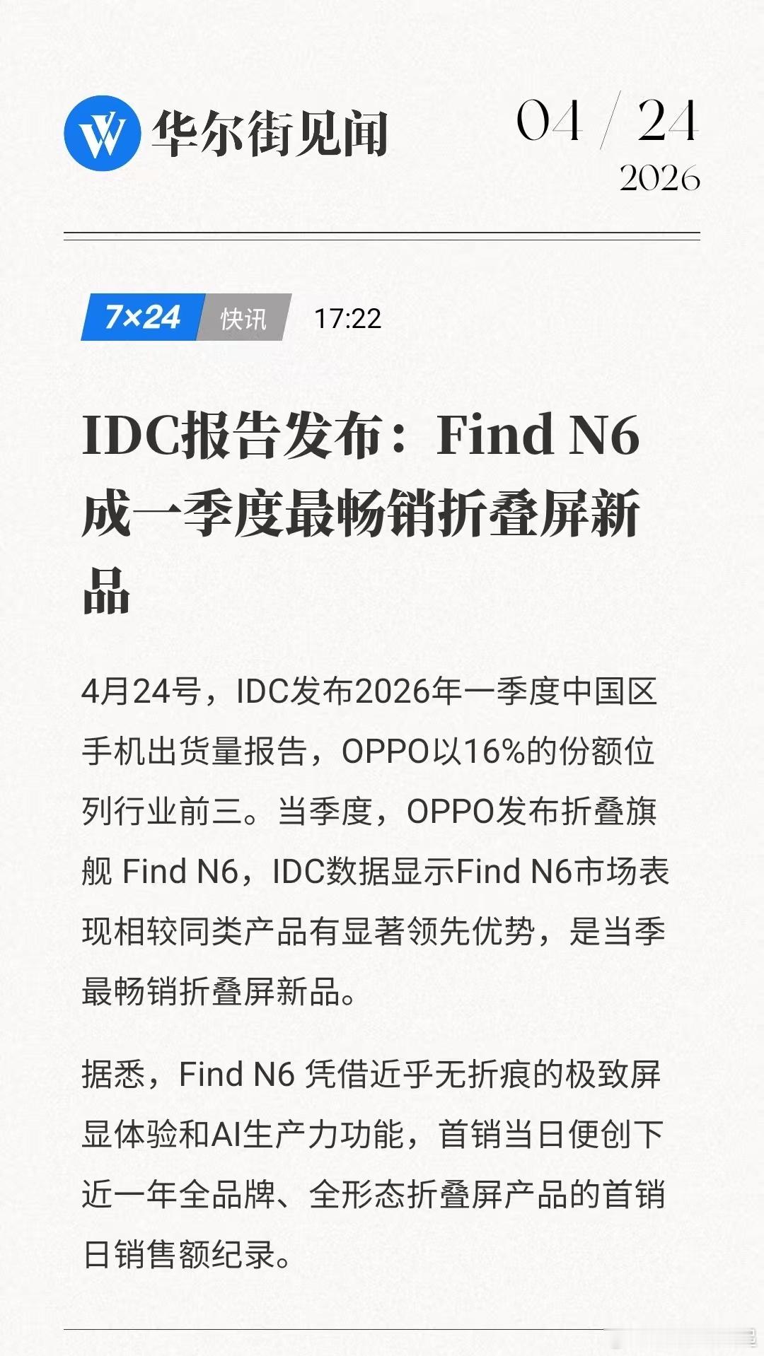IDC: OPPO Find N6是2026Q1当季最畅销折叠屏新品,好产品大家看得见! 主要是这个折痕控制太优秀了,今年可能都没有对手,不信等苹果折叠出来再看看