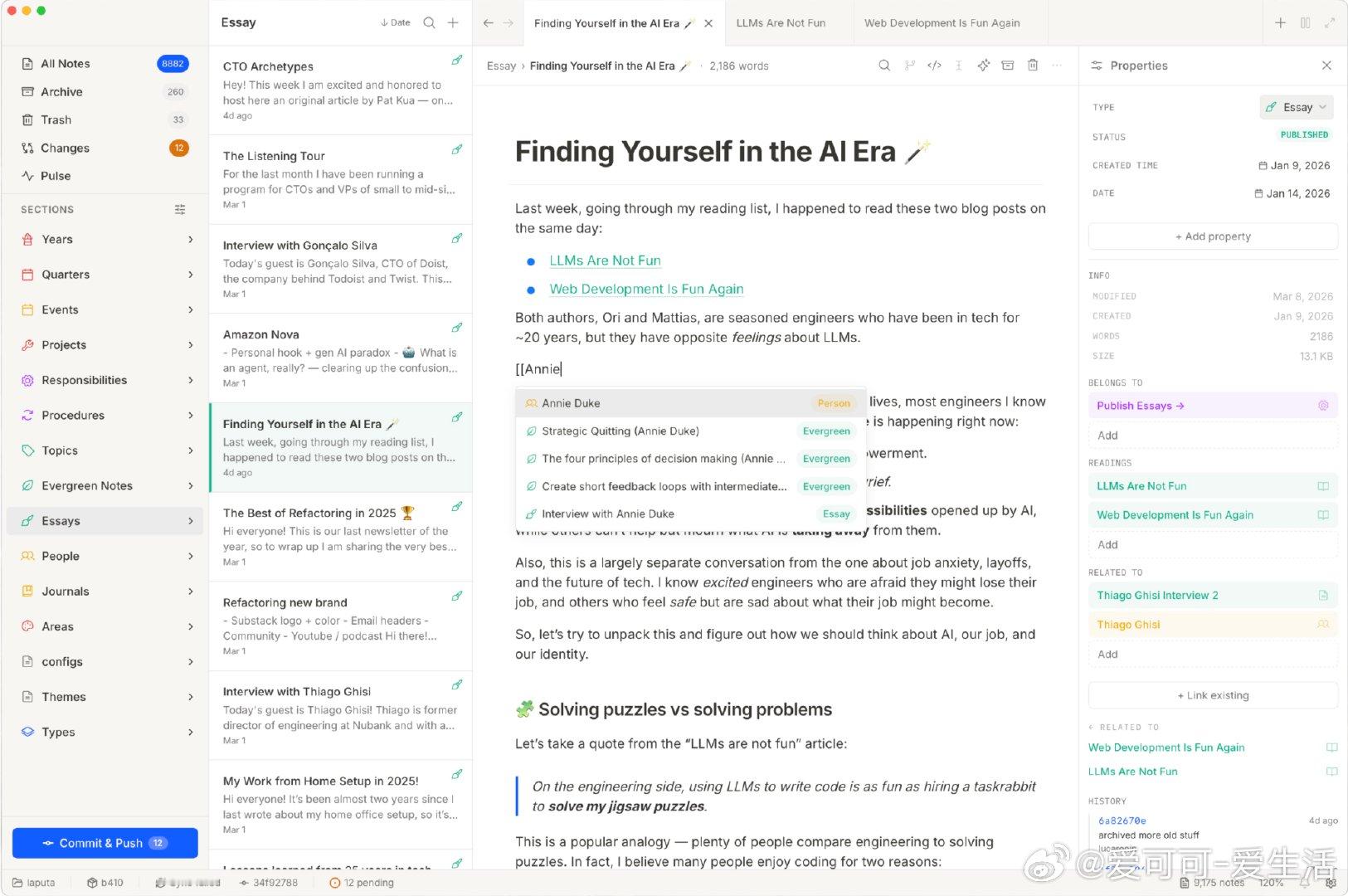 不仅有类Notion的富文本编辑器和原生Git版本控制,还支持Wiki链接、拖拽图片、Claude Code集成,甚至内置MCP服务器让AI代理轻松访问你的笔记。