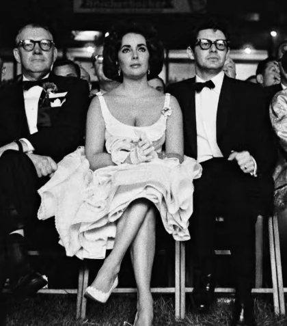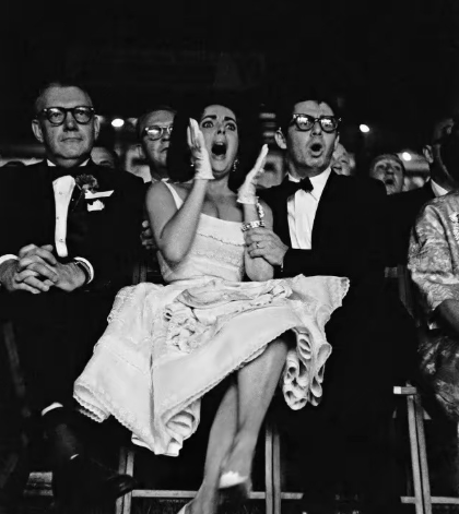 这组定格伊丽莎白·泰勒看拳击比赛时瞬间反应的黑白影像,堪称好莱坞黄金时代最鲜活的情绪切片。画面中,泰勒身着轻盈的白色礼裙,白手套衬得肌肤莹润,从掩面惊呼、张大嘴呐喊到合十祈祷,一连串毫无修饰的表情被镜头精准捕捉,毫无巨星架子的生动模样极具感染力。