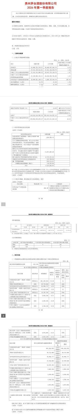 贵州茅台一季度财报来了!2026年一季度归母净利润272.43亿元,同比增长1.