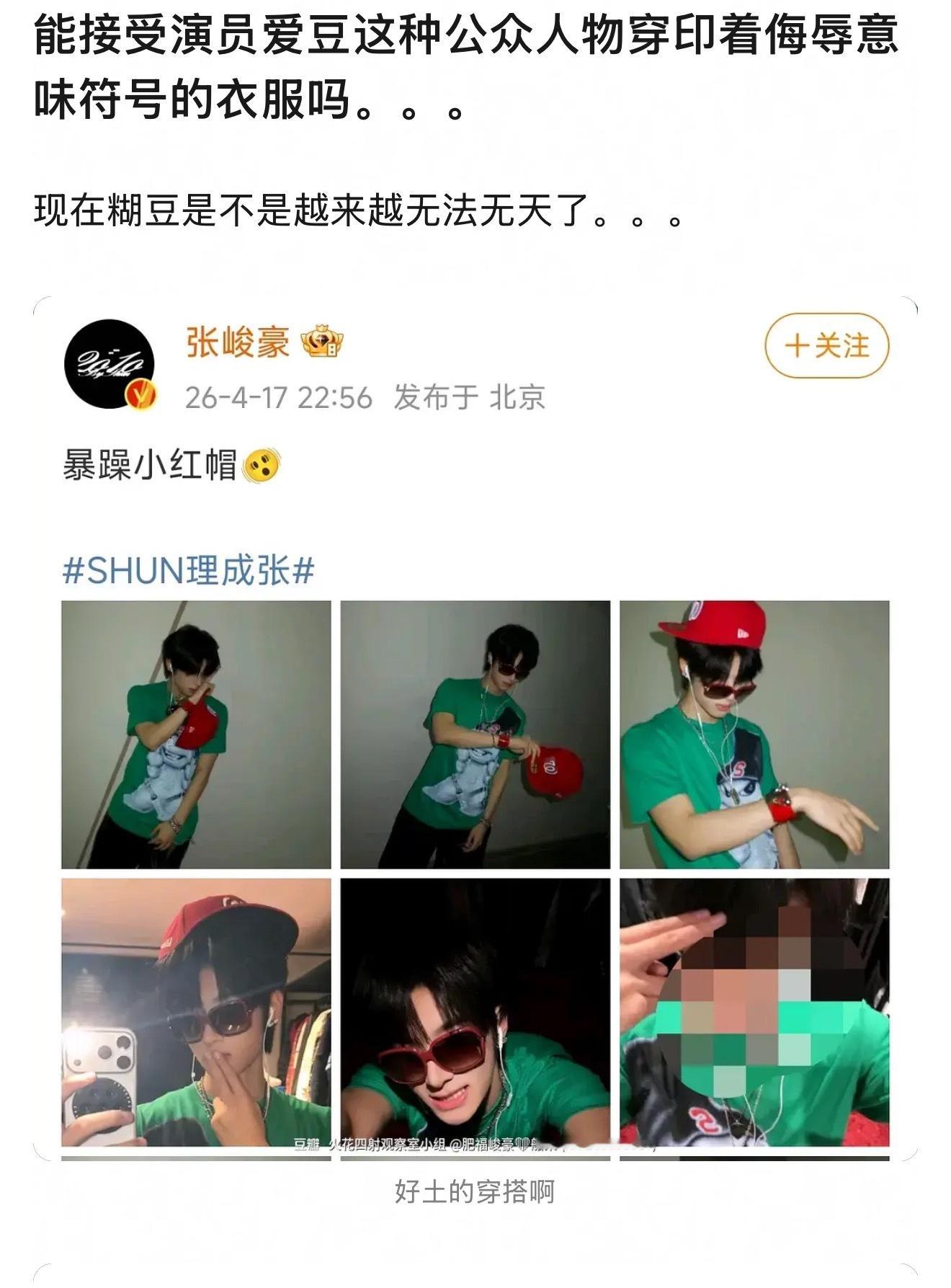 张峻豪的穿搭被审判了,你能接受演员爱豆这种公众人物穿印着这种符号的衣服吗?