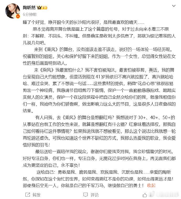 陶昕然发长文回应淘汰陶昕然 不害怕淘汰害怕被恶剪 25日,发长文回应《乘风2026》淘汰,她称没有谁该走谁不该走,说自己不害怕被淘汰,最害怕被恶剪,还恳请节目组剪刀下留情;回应上节目是否想翻红,她称:“对从事站在台前工作的女性来说,就算是想翻红有什么错?红意味着选择权。”