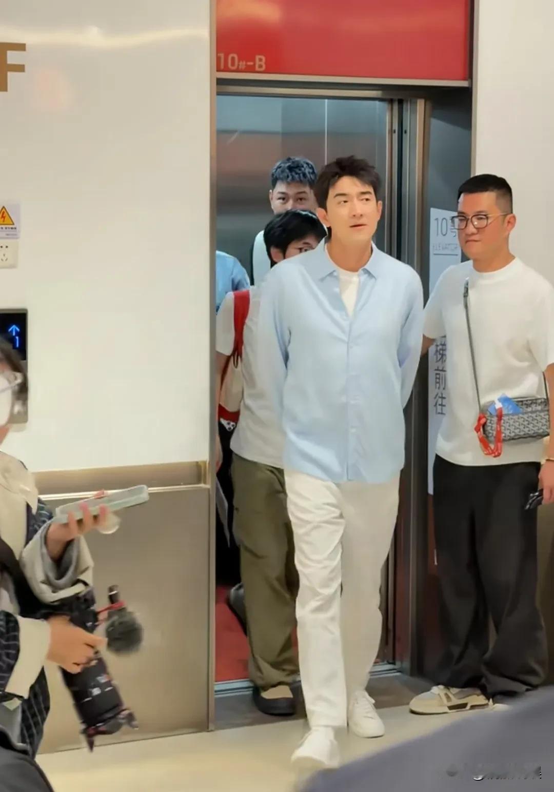 穿着蓝色衬衫白色裤子的他,身形笔挺,个子高挑,侧颜超帅,因为爱跑步爱健身,身形保持得非常好。