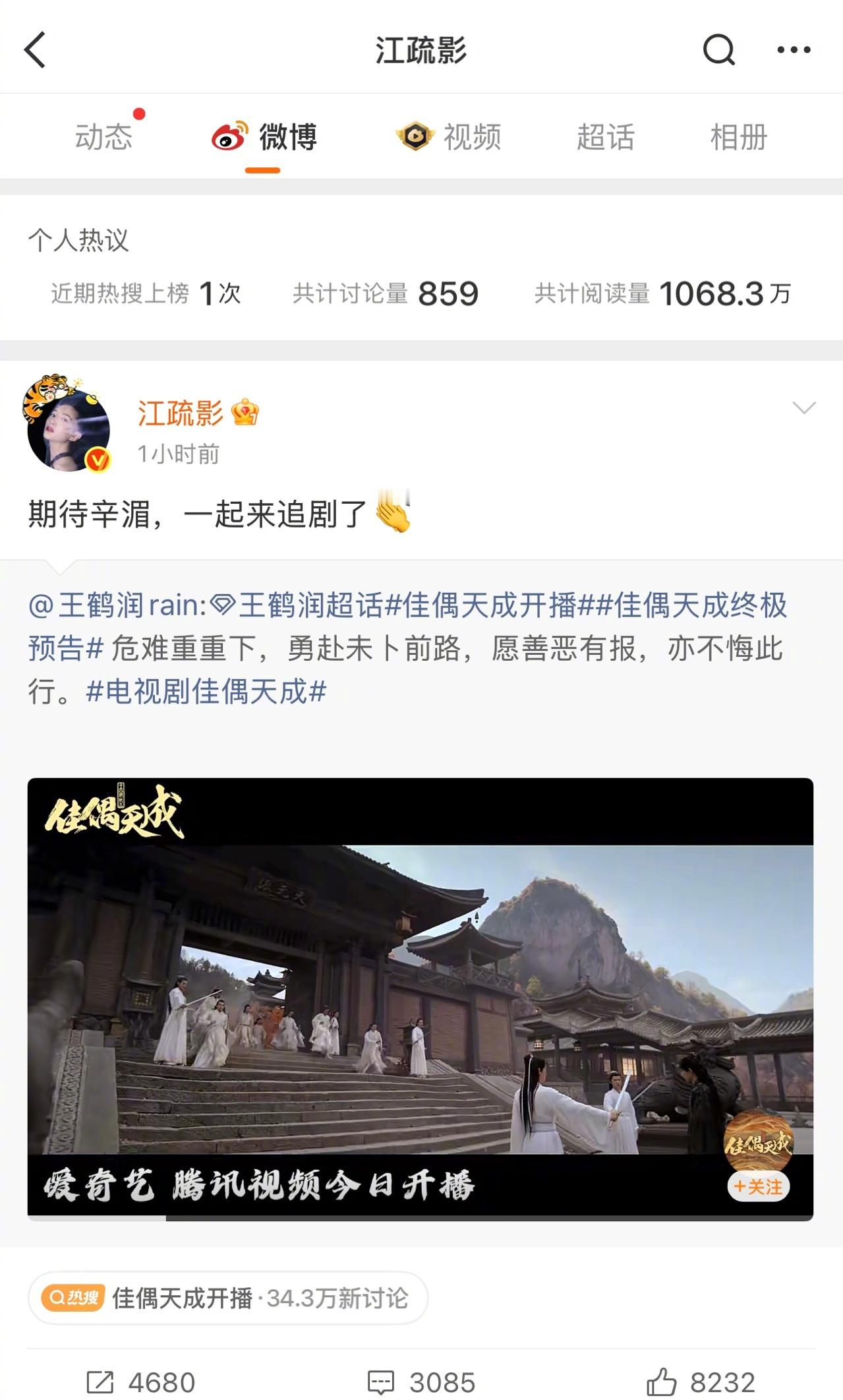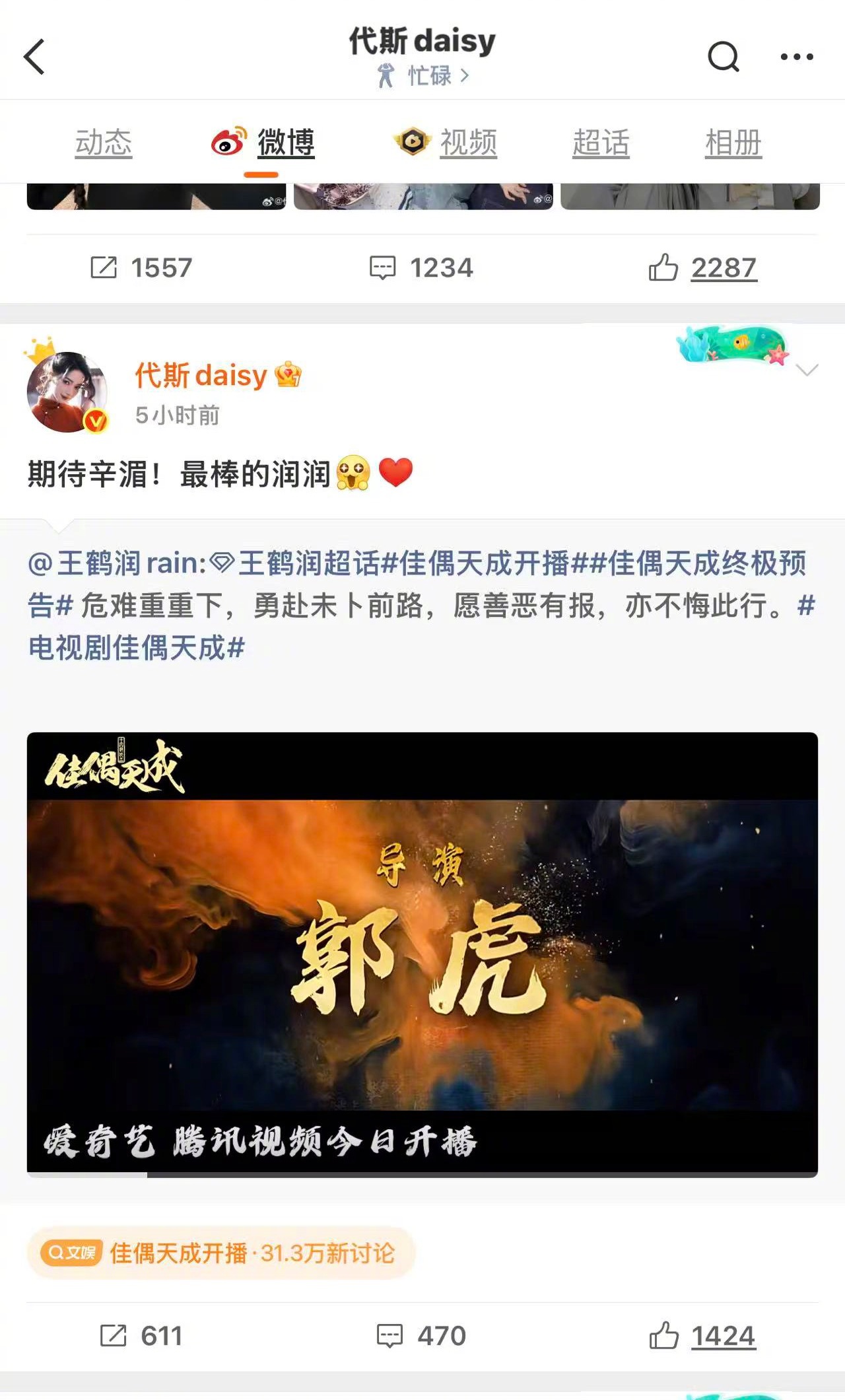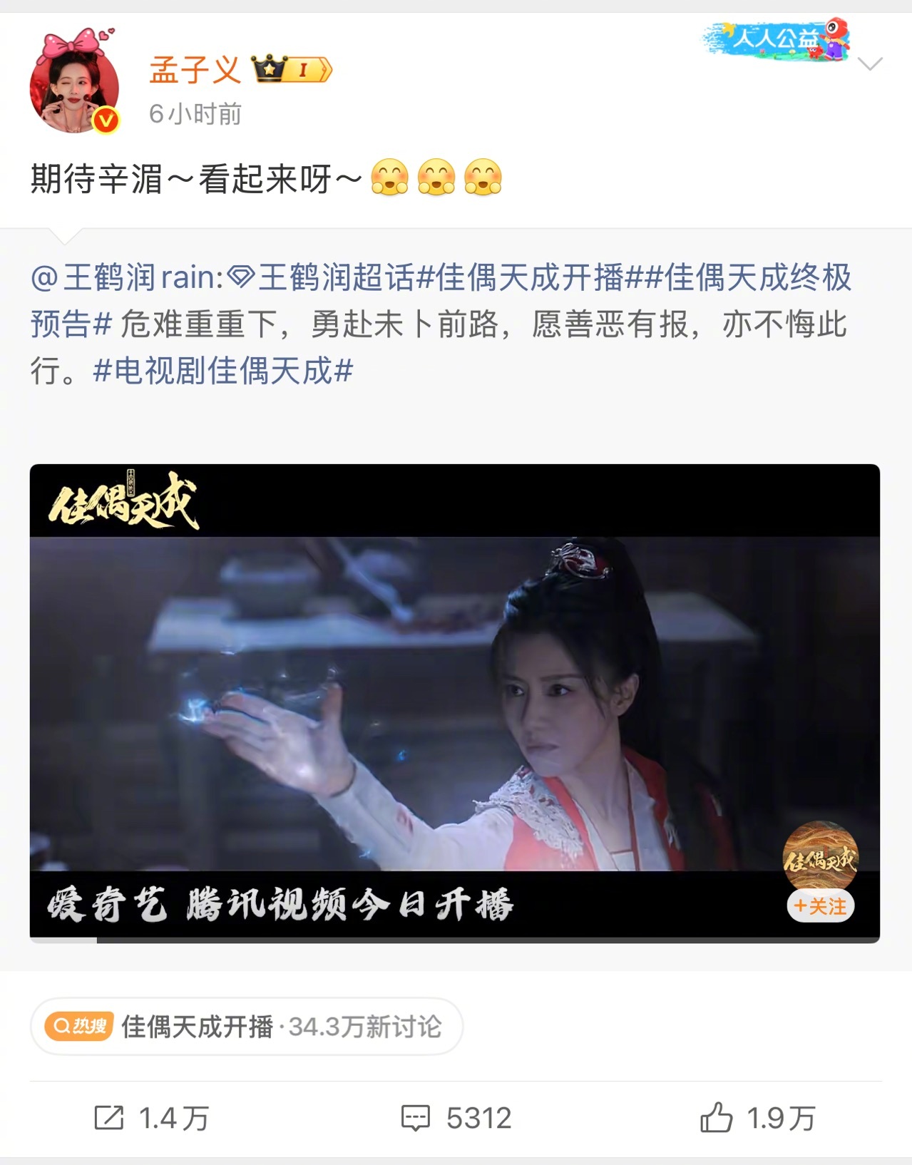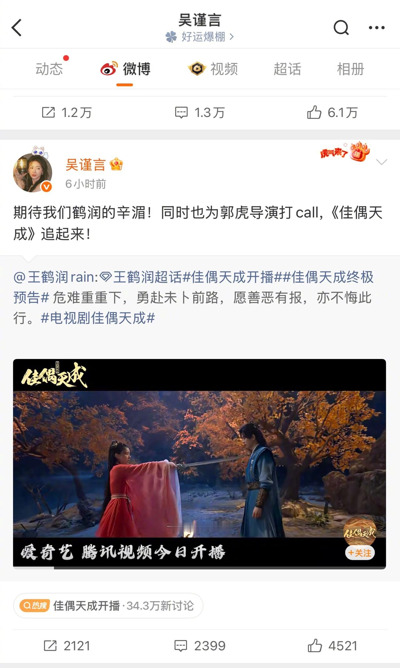 孟子义陈都灵为王鹤润新剧打call 《佳偶天成》开播大吉新剧上映,孟子义、陈都灵、吴谨言、江疏影、代斯等众多好友们转发支持,追更看到辛湄打戏超过瘾,区别传统仙侠女主,很有看点。