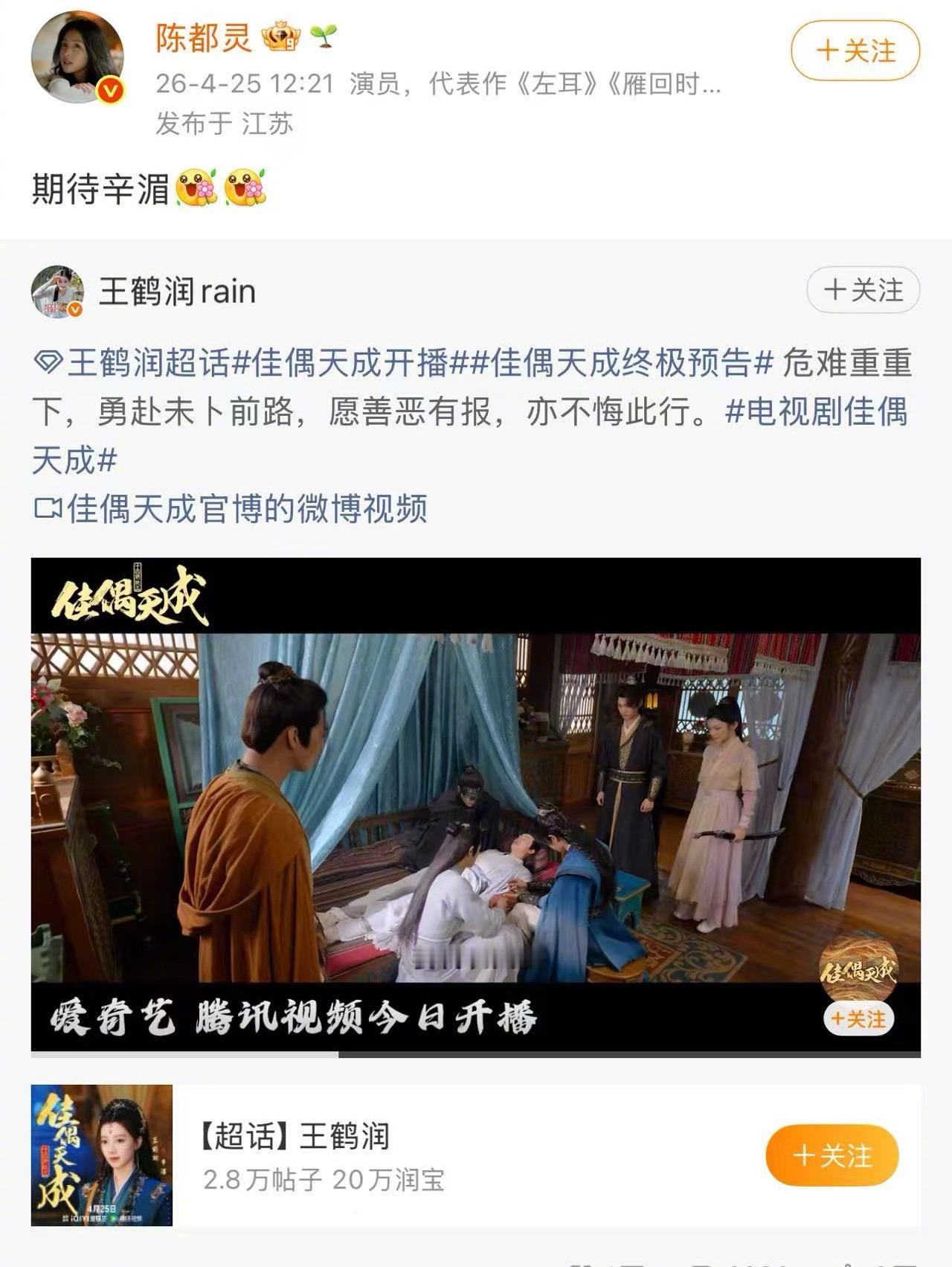 孟子义陈都灵为王鹤润新剧打call 《佳偶天成》开播大吉新剧上映,孟子义、陈都