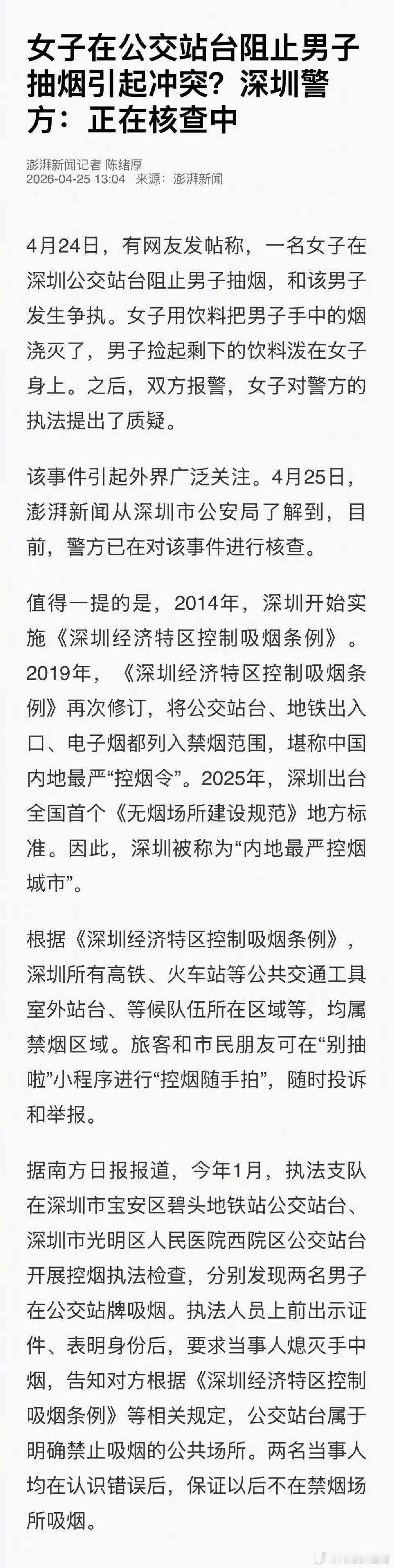 公交站劝烟冲突涉事男子已道歉:又是因吸烟纠纷而引起的热搜!下午刷到了"三手烟",晚上刷到了"劝烟争执",我以为公共场所,能不吸烟就不吸烟,不要任性而为,也不要不尊重他人健康、不遵守公共规则。官方通报女子劝阻男子吸烟引争执深圳公交站台吸烟男子被罚款江南微评 吸烟虽是个人行为,但也要社会公共规定。