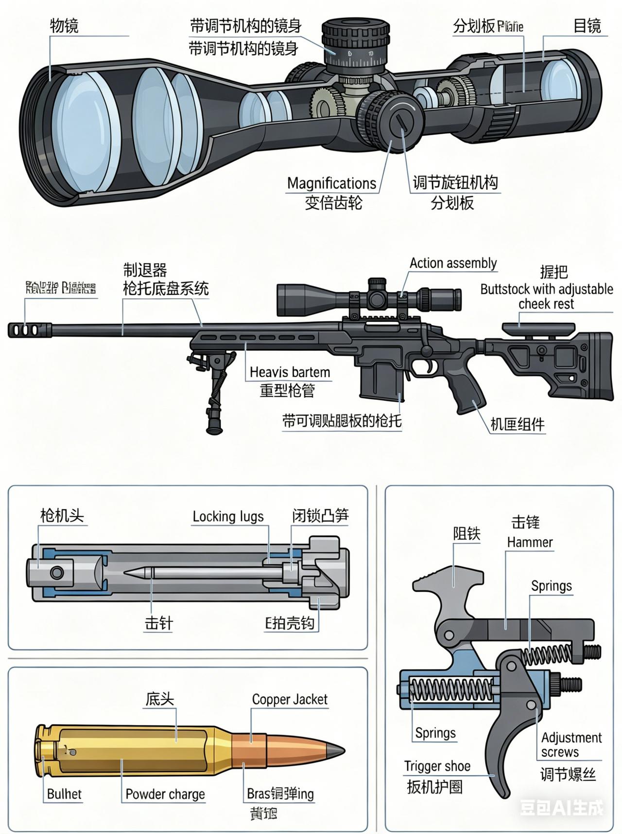 这张解剖图把现代狙击步枪的每一个关键部位都标得清清楚楚,从瞄准镜到子弹,从枪机到扳机,一次讲明白👇