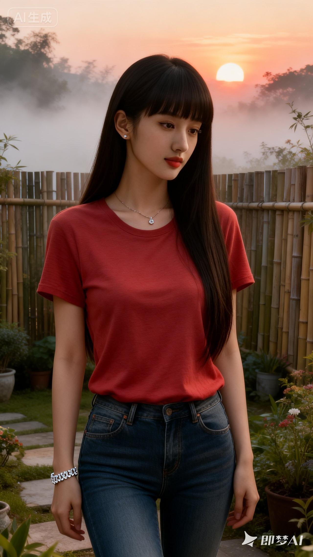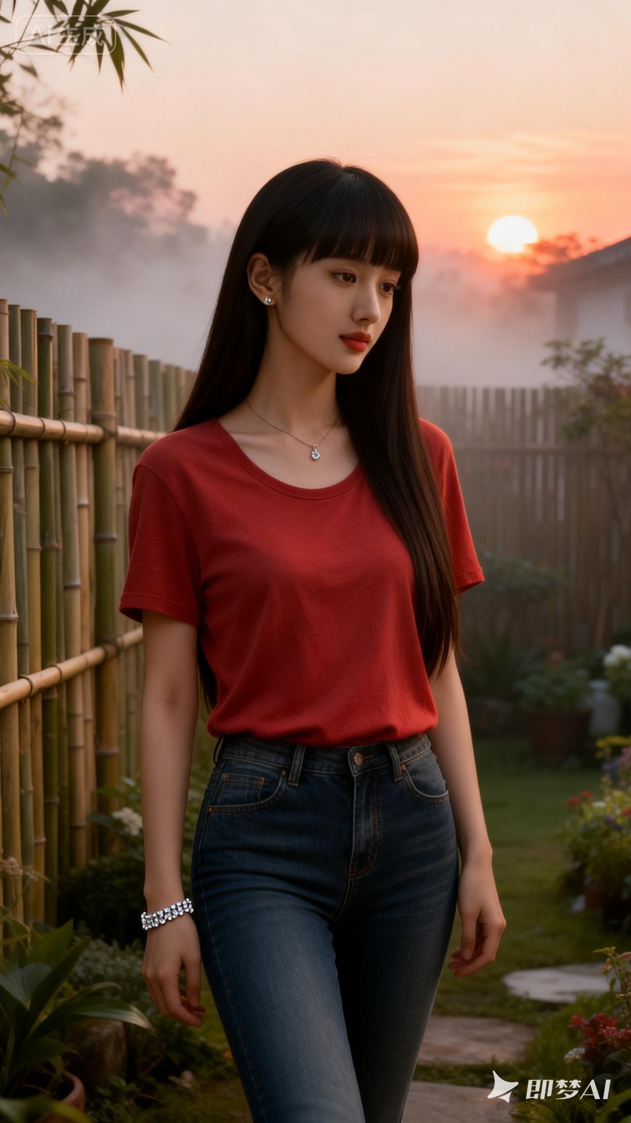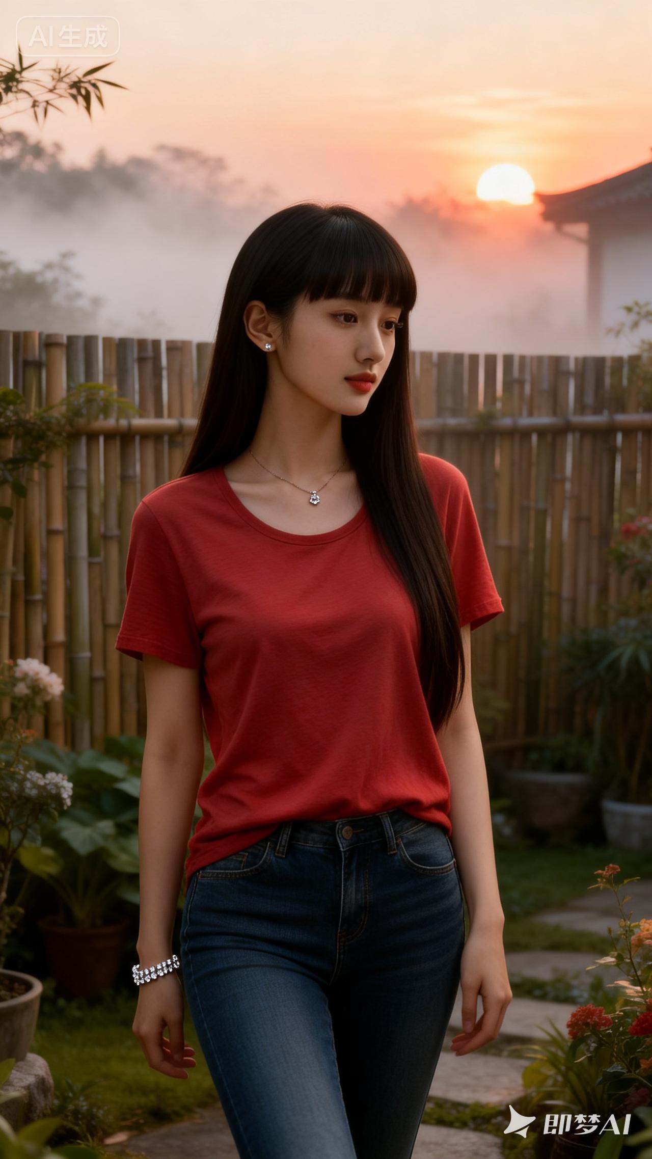 落日余晖下,少女漫步竹林间,红衣蓝裤,自然清新。