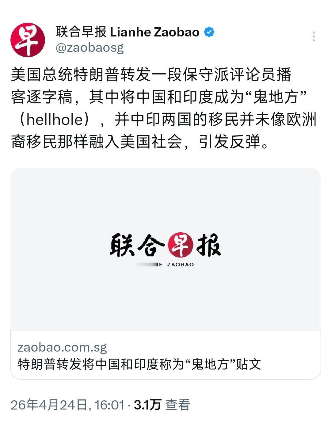 新加坡联合早报今天(4月24日)报道:“美国总统特朗普转发一段保守派评论员播客逐字稿,其中将中国和印度成为‘鬼地方’(hellhole),并指中印两国的移民并未像欧洲裔移民那样融入美国社会,引发反弹。”