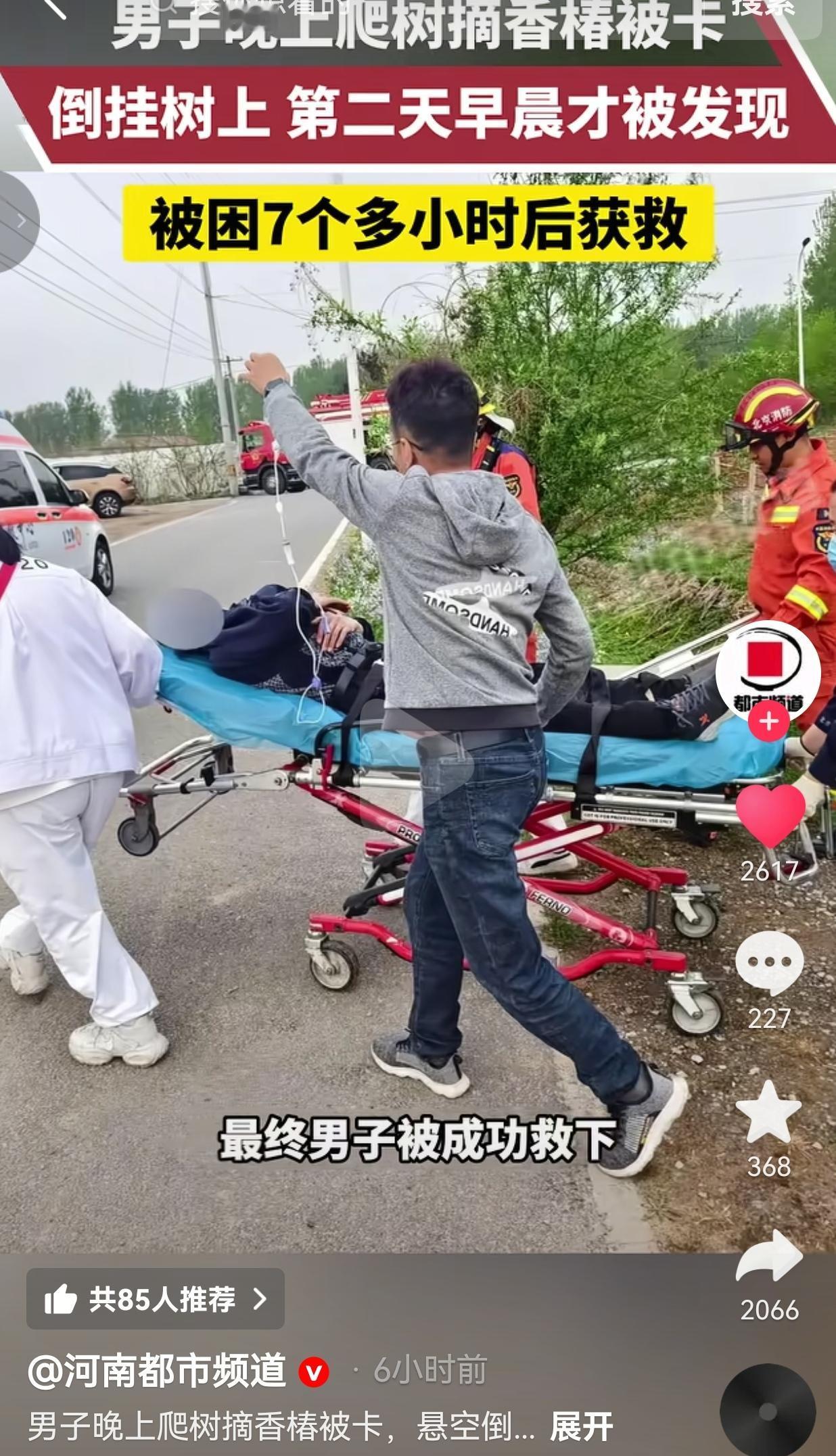 近日,北京顺义一个大男人,大半夜不睡觉,非得爬树摘香椿。结果脚一滑,整个人直接倒栽葱,小腿卡在了离地3米高的树杈里,人就这么头朝下、脚朝上,悬空挂在树上,动都动不了。