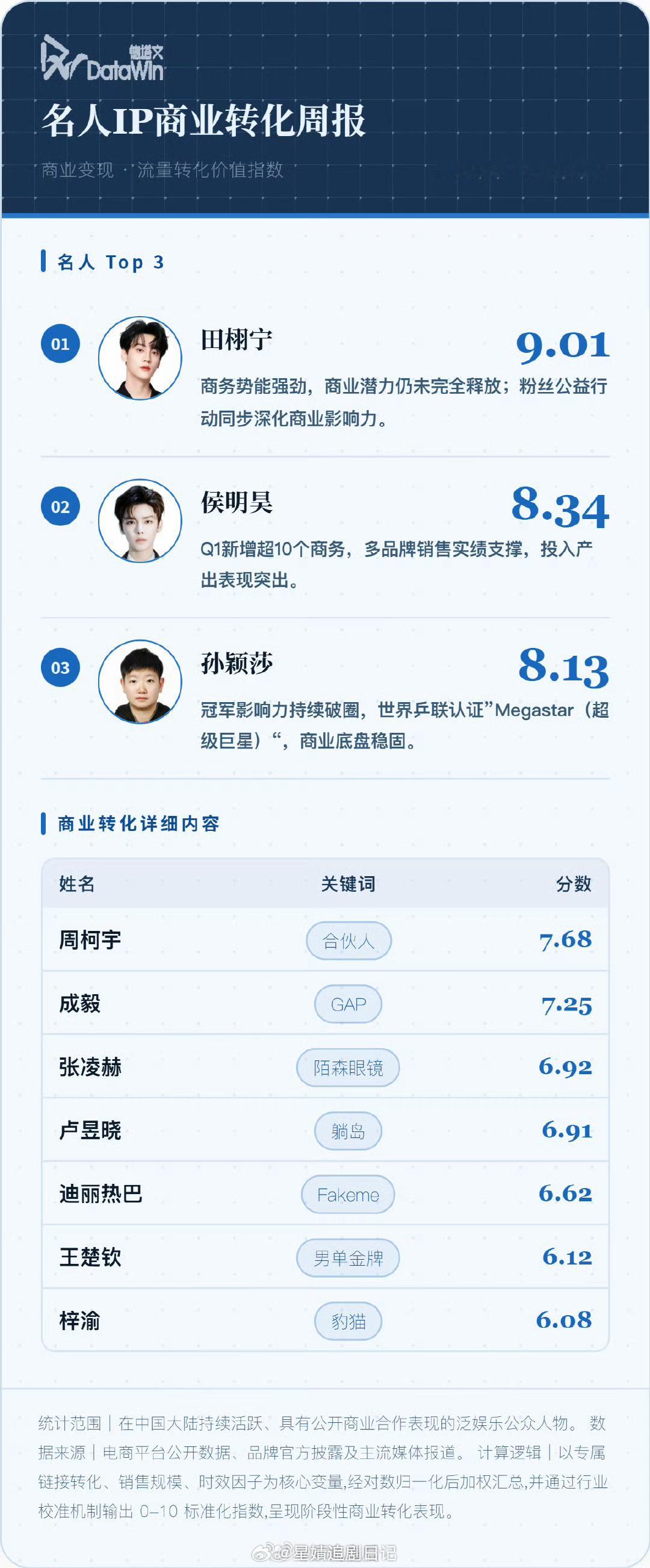 商业变现 流量转化指数top3 田栩宁 侯明昊 孙颖莎