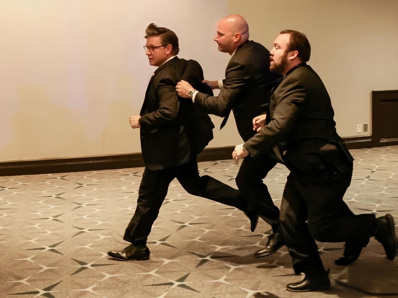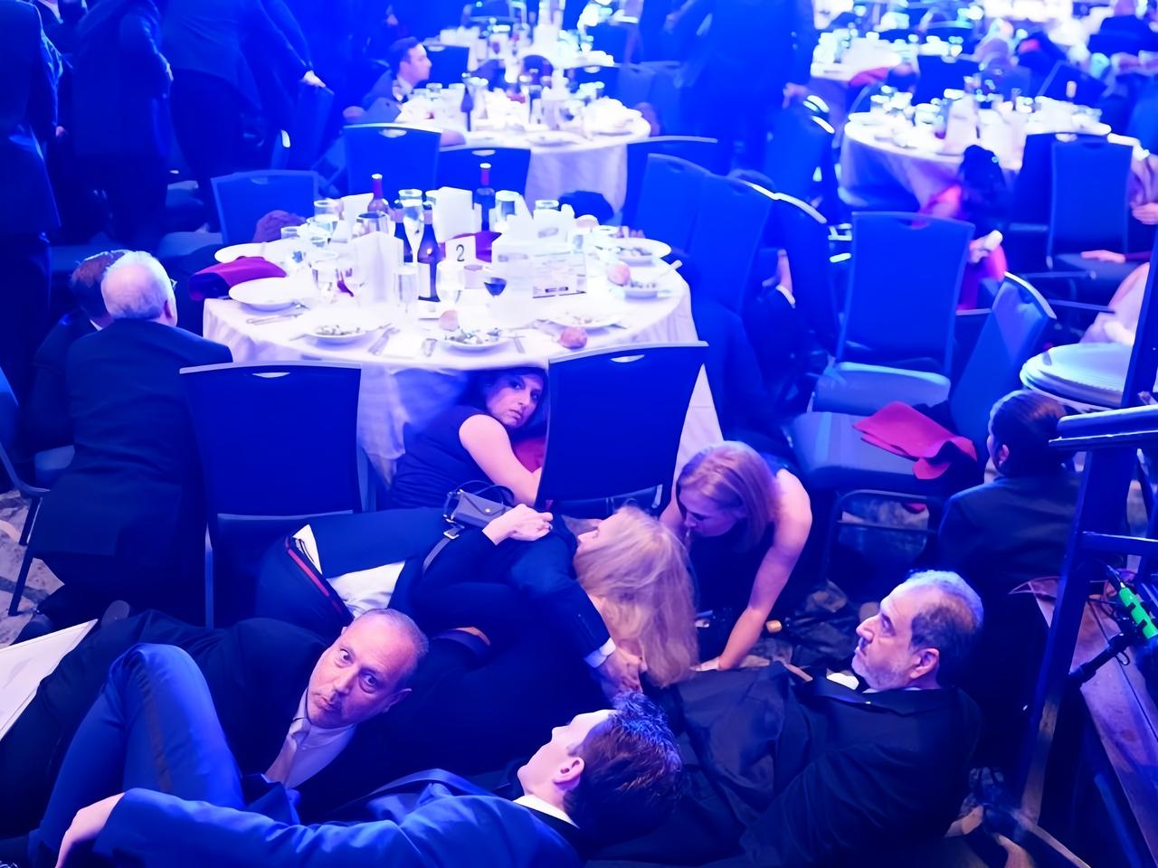 刚才央视新闻跟进报道了事件细节:事发初期,特朗普夫妇正与一名男子交谈,听到枪声后,该男子与特朗普夫人及莱维特均面露惊讶,唯有特朗普十分淡定。随后宾客们纷纷躲到桌子下,特朗普夫妇也不例外。最后,在特工保护下,特朗普夫妇起身快速撤离现场。