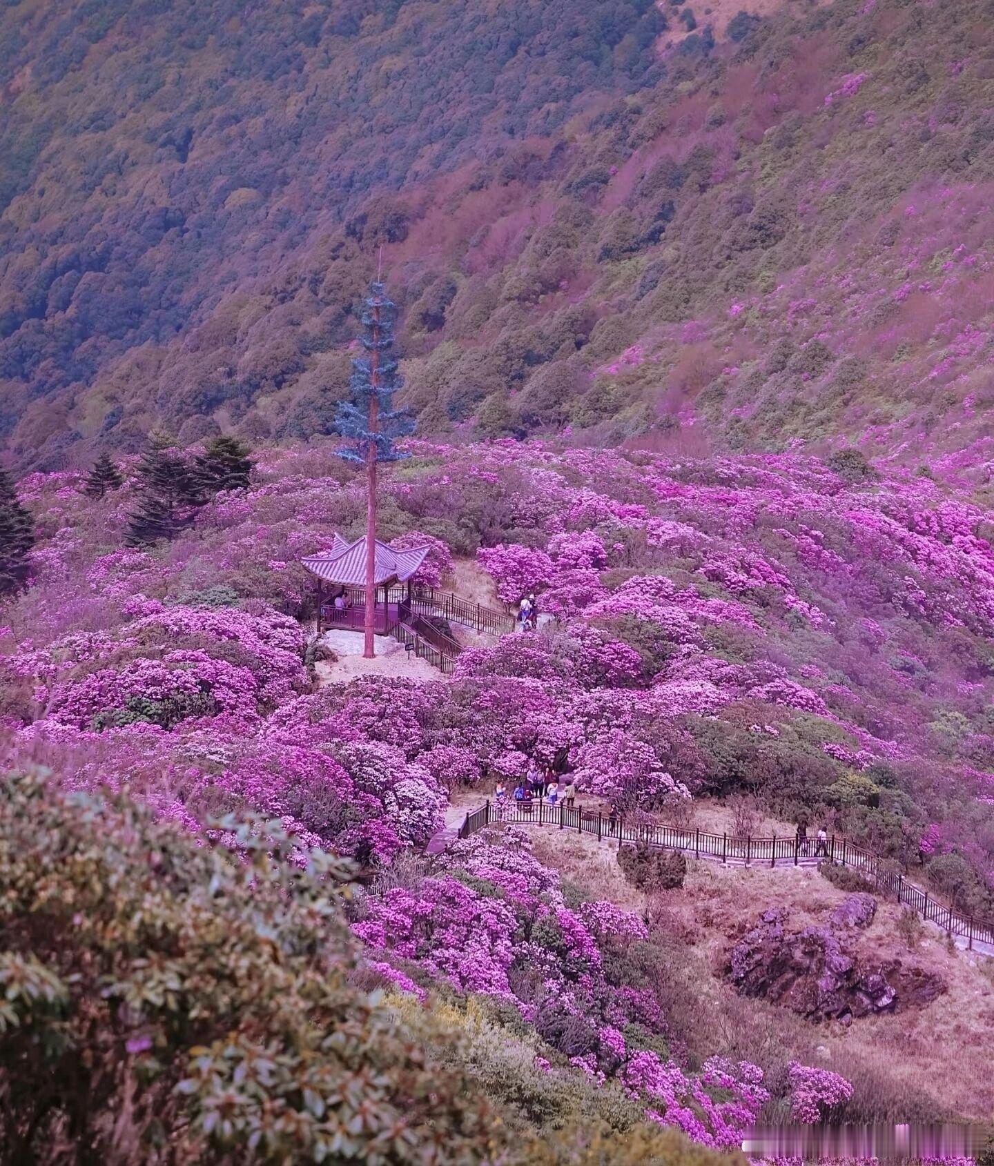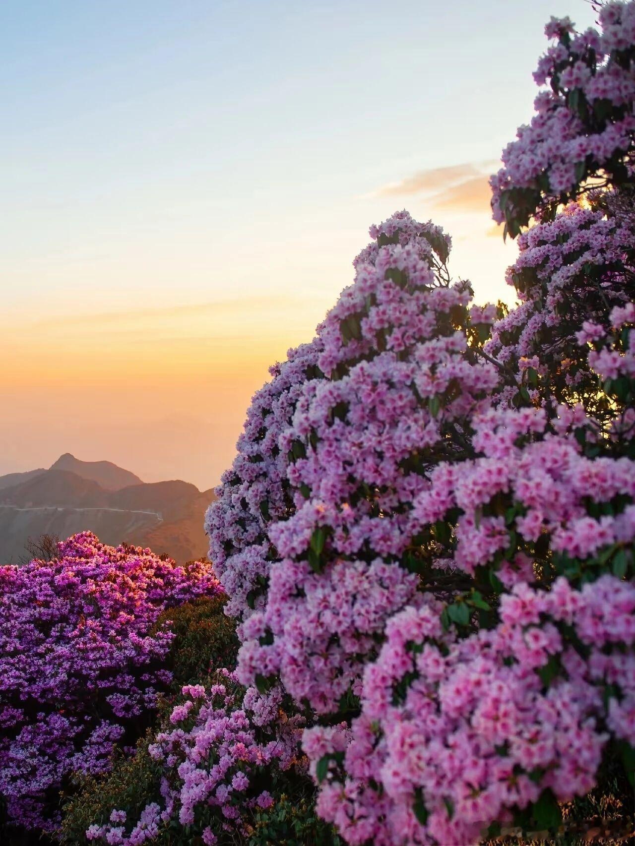 1.1万亩原始杜鹃林漫山遍野,50多个品种竞相绽放,珍稀黄色云锦杜鹃藏于其间,山野间繁花连绵,原生态花海壮阔又治愈,4月下旬到5月正是最佳盛花期,一眼沦陷。