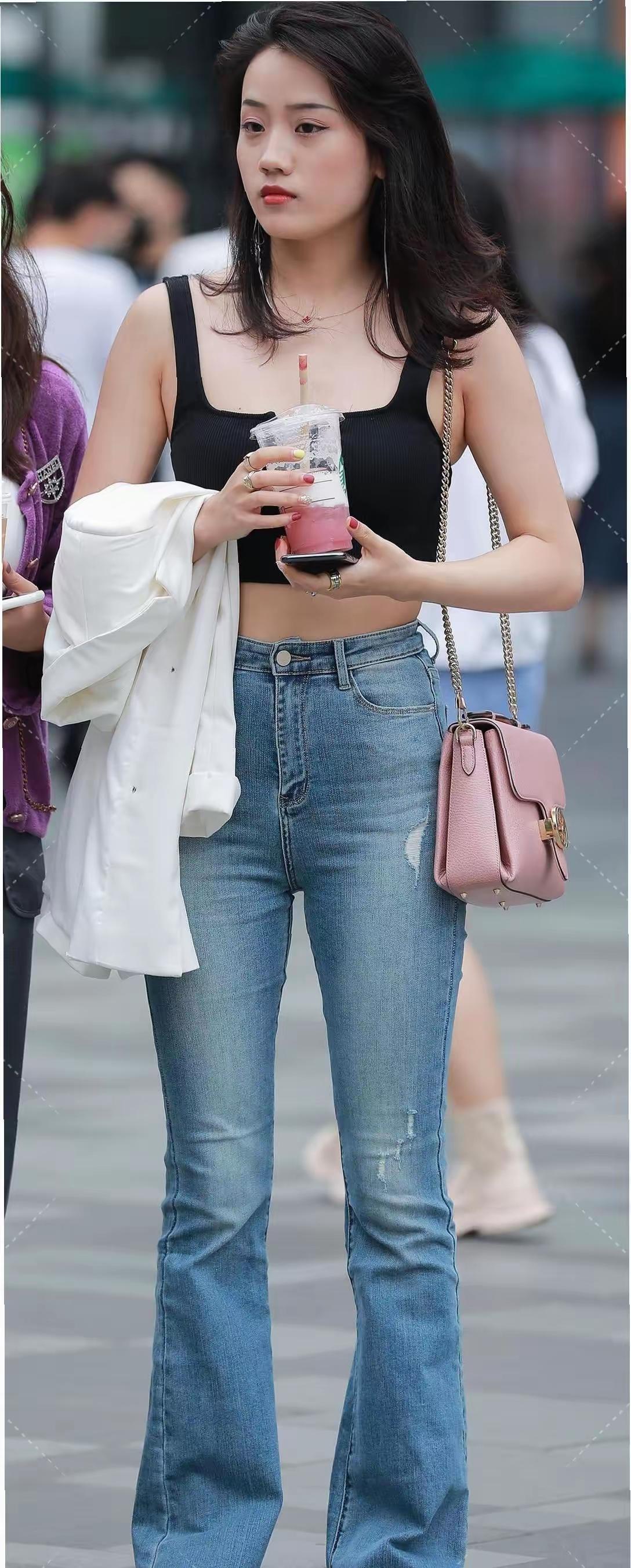 都市时尚女孩,黑色背心搭配牛仔裤,手拿粉色包包,享受夏日饮品。穿搭 街拍