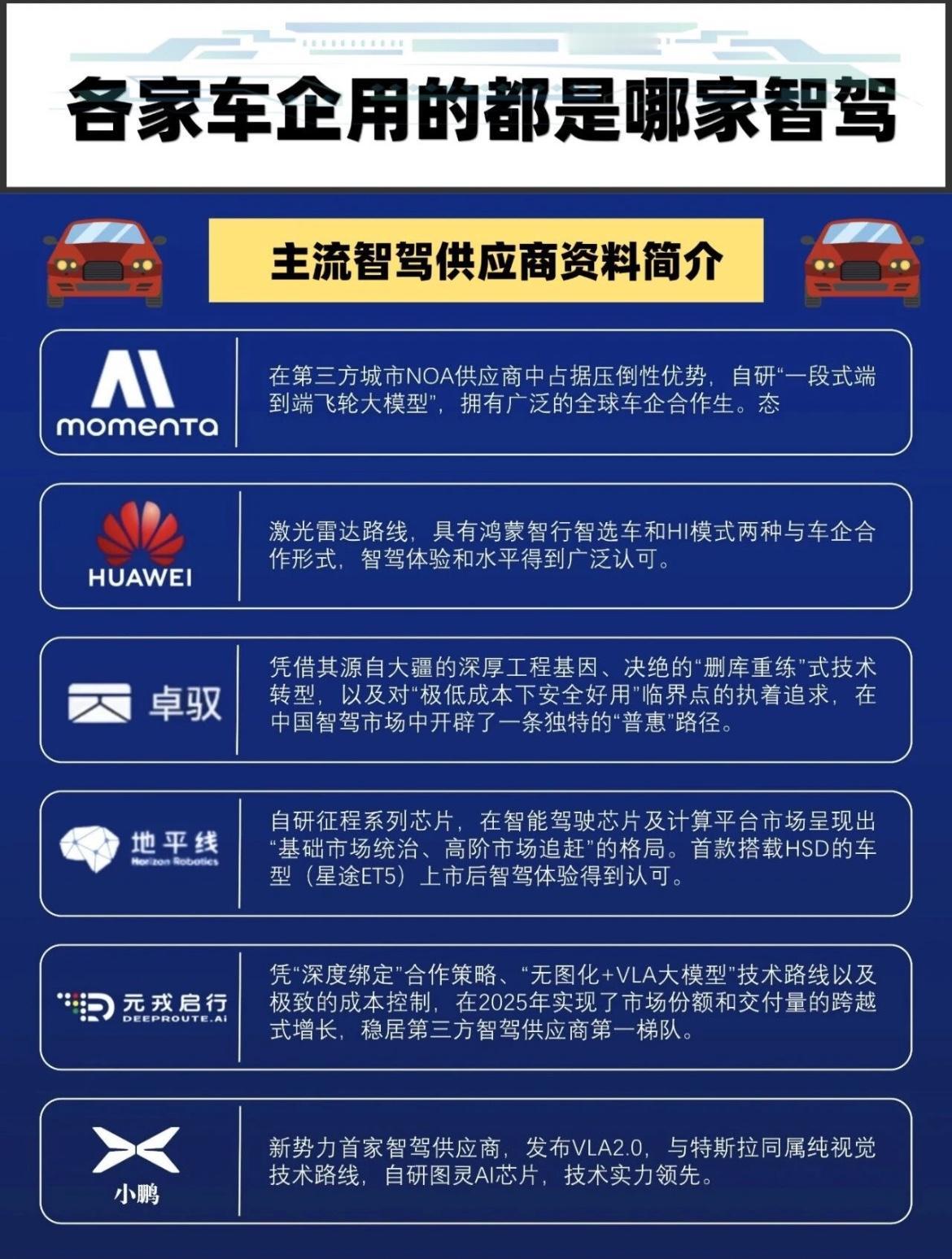 各家车企用的都是哪家智驾? 民间一直都有传言:智驾只有两种,华为和其他。 而真正的智驾供应商却真的也不多,流派上来说分为两大派:激光雷达和纯视觉技术方案。 从造车方来说都号称自研技术的智驾方案,可实际上大多数都顶多算一个智驾与硬件的集成商,真正的智驾都依赖第三方技术供应商,除了特斯拉、小鹏和特斯拉之外。