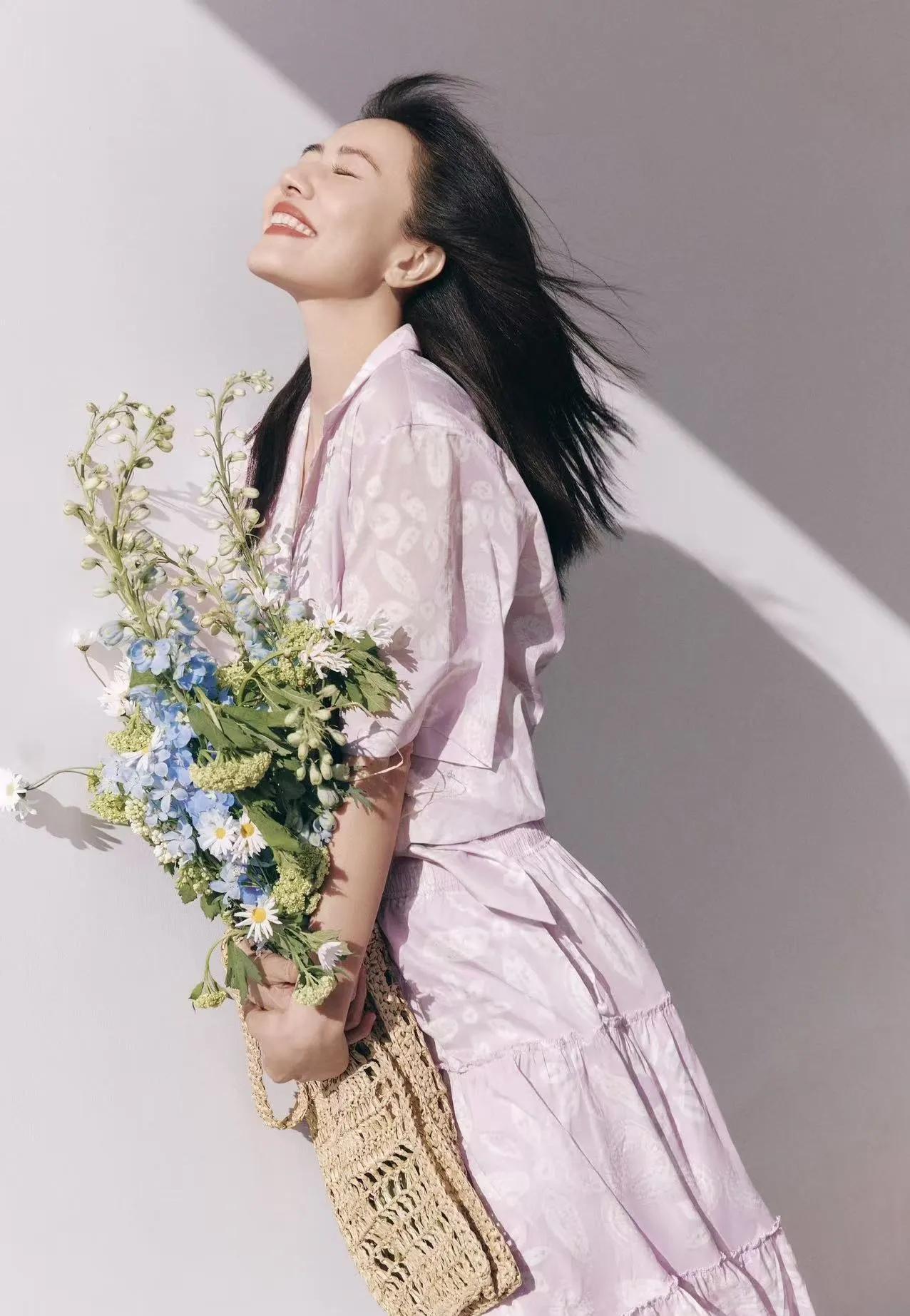 手捧花束搭草编包,焦糖色拖鞋衬出夏日清爽。笑容舒展又治愈,像阳光洒在身上,这才是真正的白月光颜值啊!