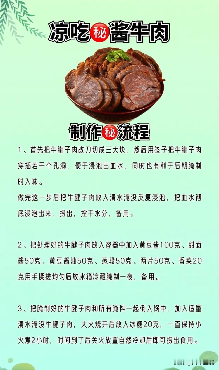 技巧:牛肉切块后焯水,放入卤料中炖煮1.5 - 2小时,直到牛肉软烂入味。
