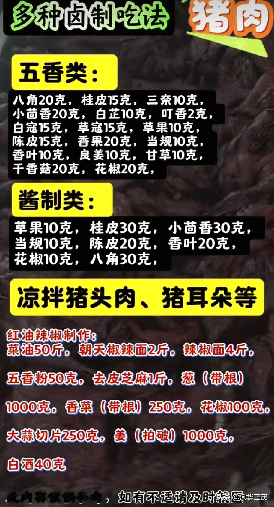 比例搭配:八角3个、桂皮1小块、香叶2片、草果1个、小茴香10克、花椒5克,生抽和老抽比例为3:1,料酒适量,冰糖适量。