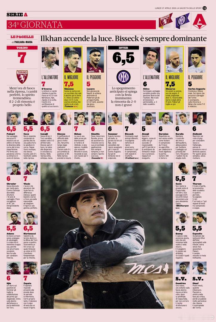 米兰体育报赛后评分如下都灵2比2国际米兰意甲热点现场 最佳迪马尔科 最差奥古斯托