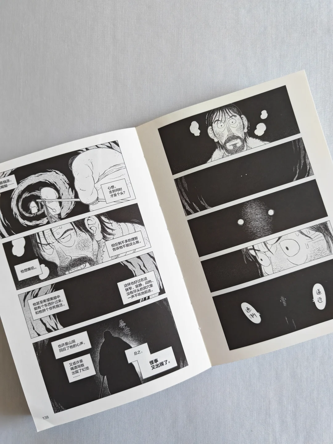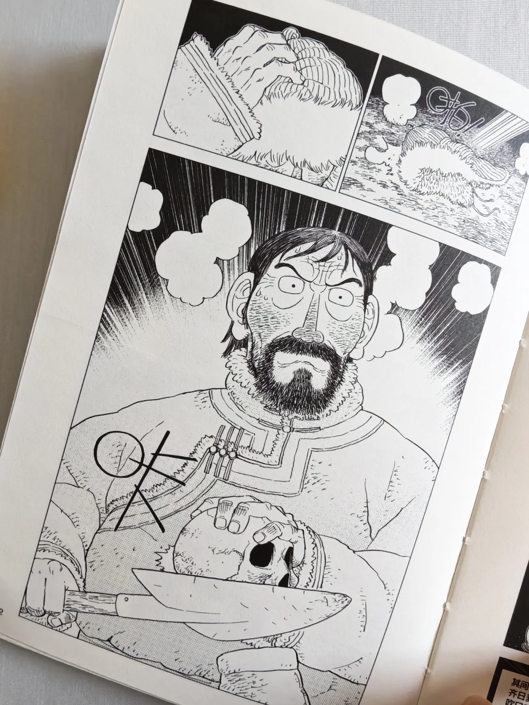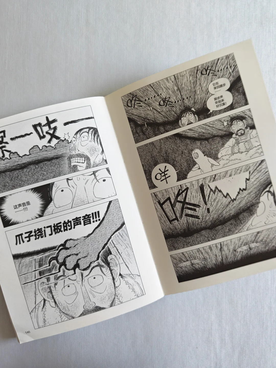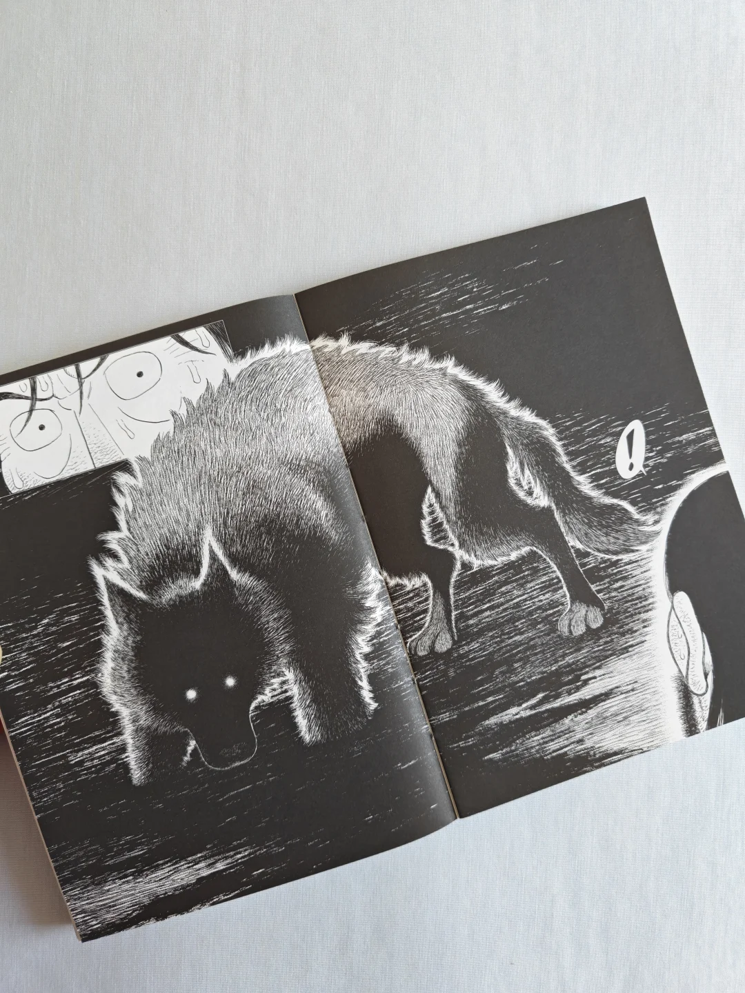 无论是狼的凶狠,还是冰天雪地草原的凛冽,跨页的特写很有视觉上的冲击力。人物角色的情绪变化,没有一句台词,分镜和表情的刻画线就将极致的慌张、绝望,甚至是濒死感都烘托出来了。