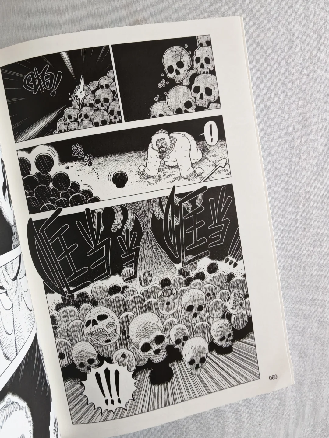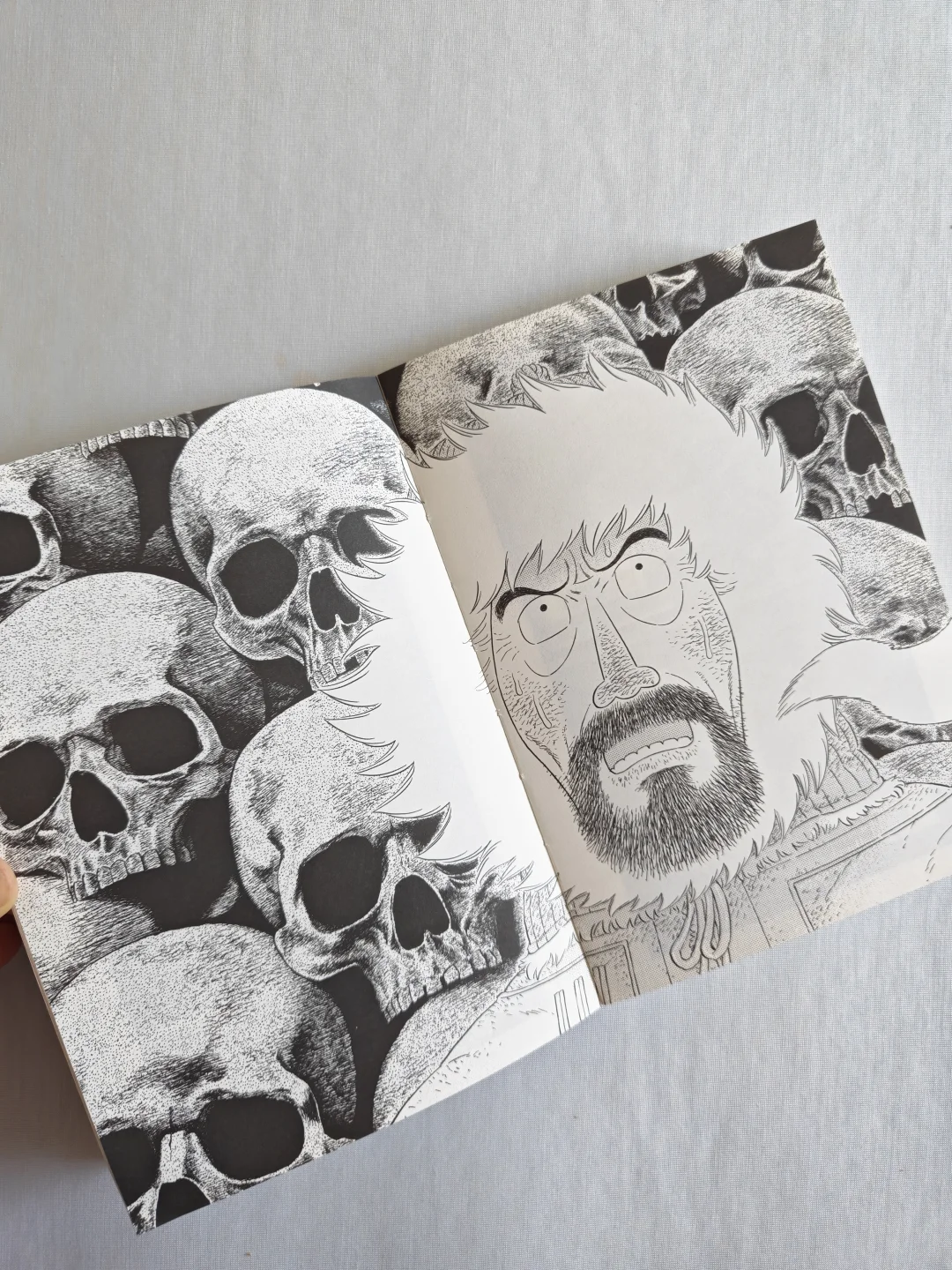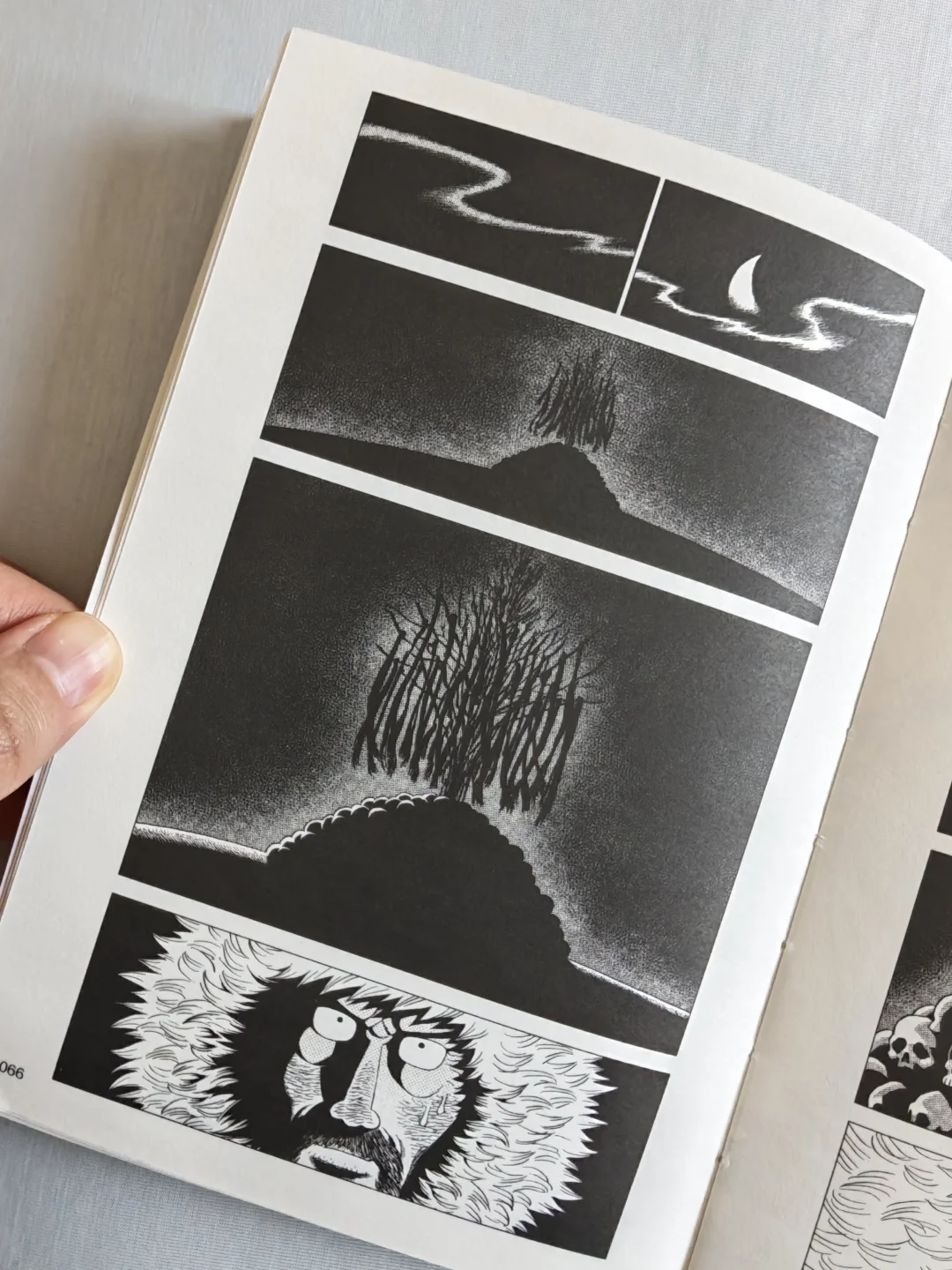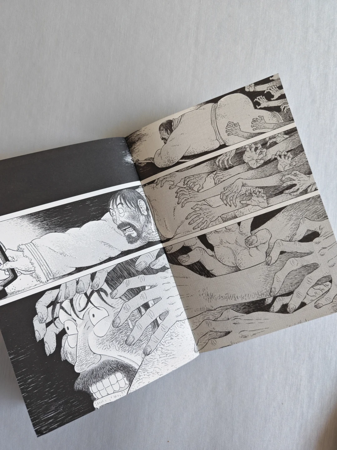无论是狼的凶狠,还是冰天雪地草原的凛冽,跨页的特写很有视觉上的冲击力。人物角色的情绪变化,没有一句台词,分镜和表情的刻画线就将极致的慌张、绝望,甚至是濒死感都烘托出来了。