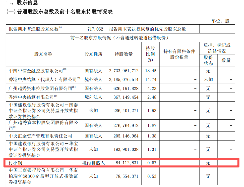 【#超级牛散持股中信约21亿#】#今年3家券商出现自然人成十大股东#中信证券2026年一季报显示,自然人付小铜持有中信证券0.84亿股A股,持股比例为0.57%,位列第九大股东。值得注意的是,据披露,股东付小铜通过信用证券账户持有公司0.84亿股A股。该数量与上述持股数量一致。以中信证券一季度平均股价25.33元计算,付小铜此次持股参考市值高达约21.31亿元。网页链接
