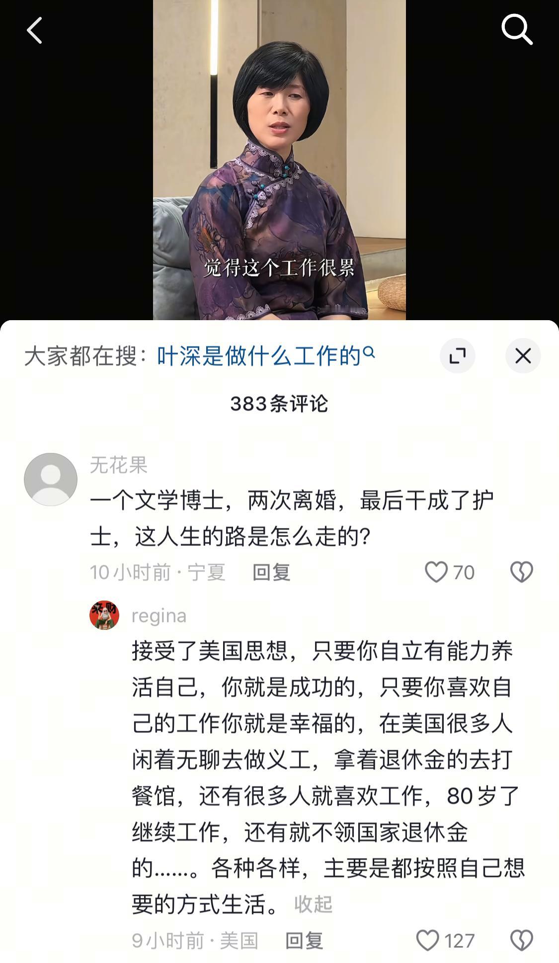 她这段话润色一下就是意林美文了!抖音上很多采访清华北大毕业的那些老奶奶,她们给我的感觉也是享受工作,非常有正能量。这和美国思想还是中国思想有什么关系呢就像叶深,她不是去美国了才有的美国思想,她在中国的时候第一任丈夫出轨,她就在那样的情况下还是以第一名的成绩考了研究生。那在美国的中国人,过得很好的话并不是受美国思想的影响,而是本身骨子里就是要强的人。