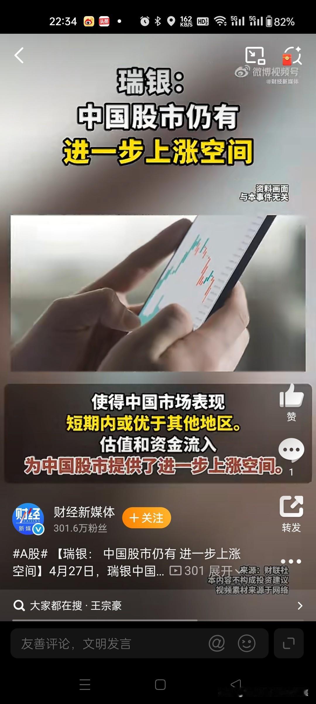 2026年4月27日,瑞银中国股票策略研究主管王宗豪发布最新观点,认为短期内中国股市表现或优于其他市场,这主要得益于基本面的改善,以及中国受全球能源冲击的影响较小。