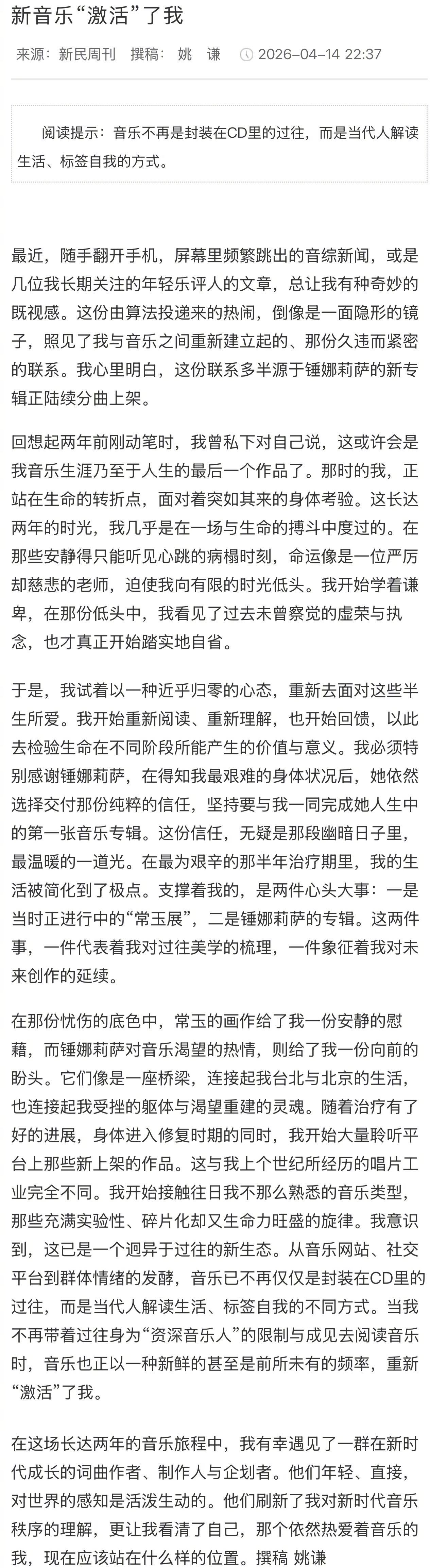 锤娜丽莎的专辑支撑着姚谦治疗期 跨代际的音乐惺惺相惜太好哭😭 姚谦老师身陷病痛、创作停滞的艰难时刻,锤娜丽莎带着对音乐的赤诚与执着找来,二人真诚合作🤝🏻用满满的用心与热爱给予力量,互相治愈了彼此的成就 锤娜丽莎专辑是姚谦封山之作