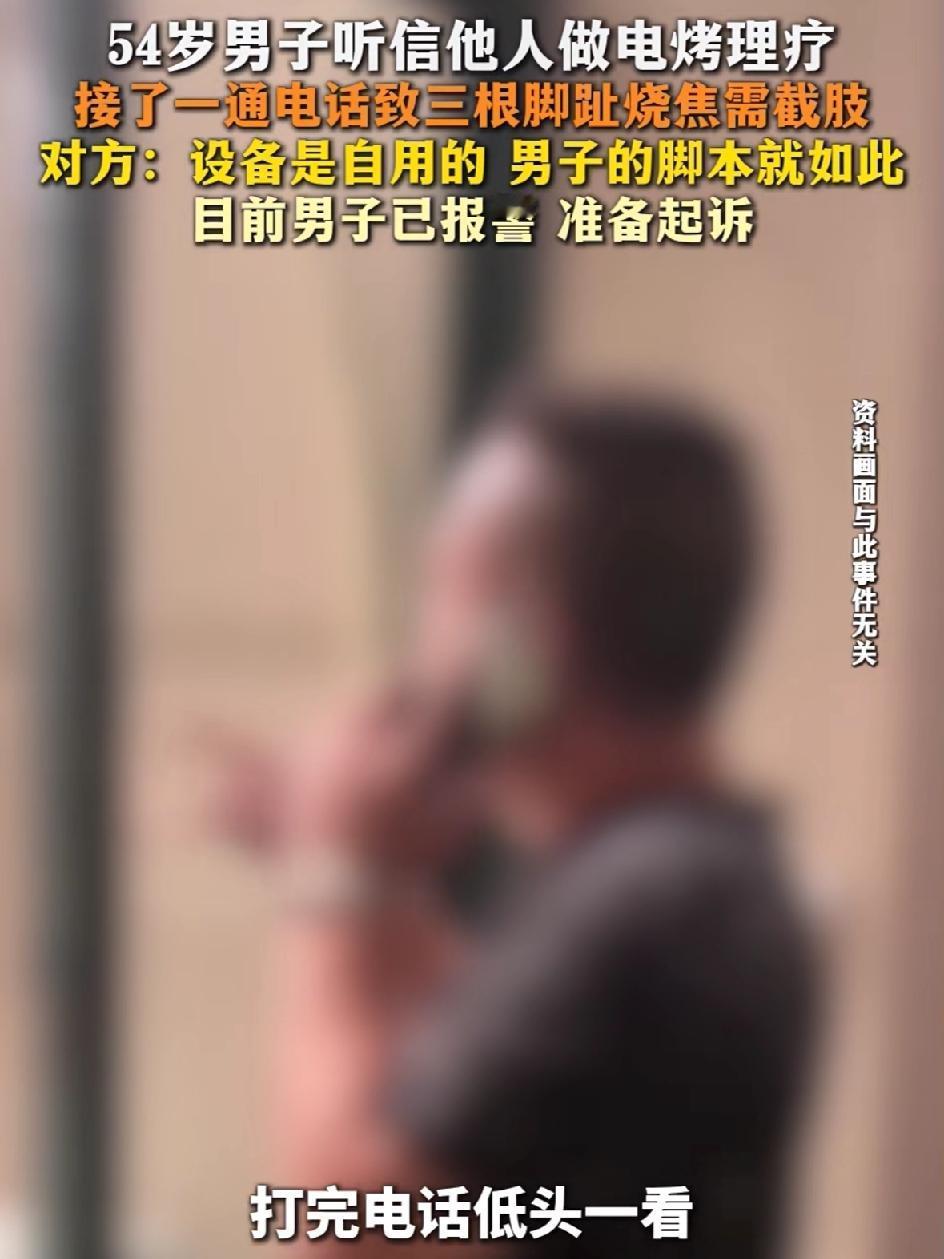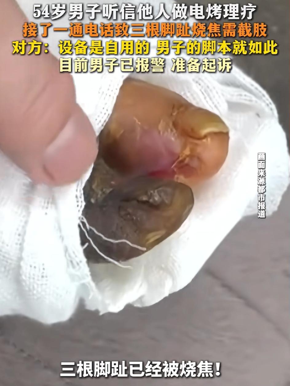 2026年4月26日报道,河南郑州,54岁男子,因患有糖尿病头晕迷糊,朋友介绍他去自己家里做电烤理疗,结果在烤到脚的时候,男子接了一通电话,挂断电话后发现自己的三根脚趾已经被烤焦,朋友赶紧将男子送到医院,经检查被告知需要截肢,男子懵了,要求朋友担责,朋友直接不干了,称设备是自用的,男子的脚本来就有问题,跟自己没关系,对此男子拿出证据自证,随后报警!