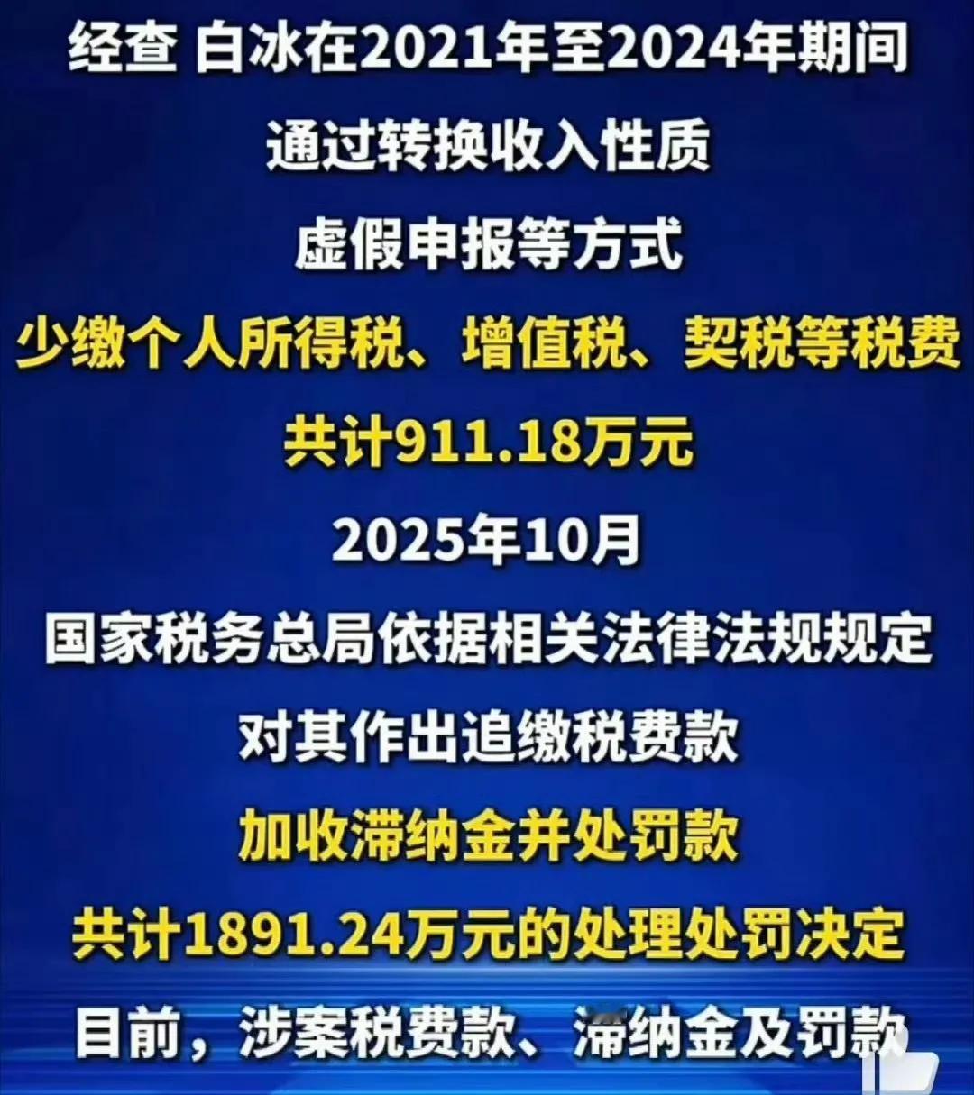 至于白冰的偷税漏税,根据调查的结果来看,通过频道转换收入性质,利用虚假申报的手段,从个税、增值税、契税等税收费用共911.18万元,开具的处罚金额更是高达1891.24万元,好消息是,对于所有的款项,白冰方也是如实缴纳。