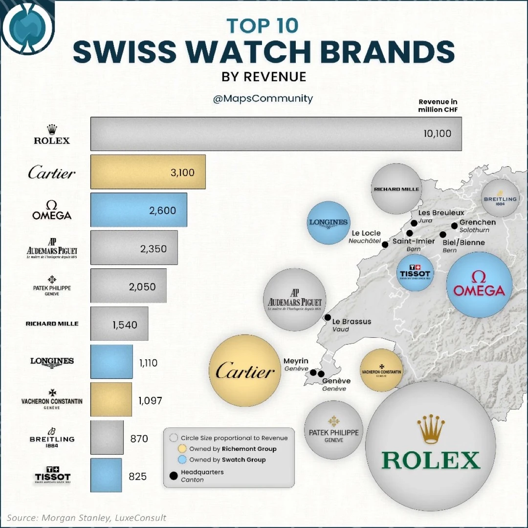 这张图展示的是全球最顶级的瑞士腕表品牌按营收排名,单位为百万瑞士法郎。毫无悬念,Rolex以约101亿瑞士法郎遥遥领先,几乎是第二名的三倍,稳坐行业绝对霸主。
