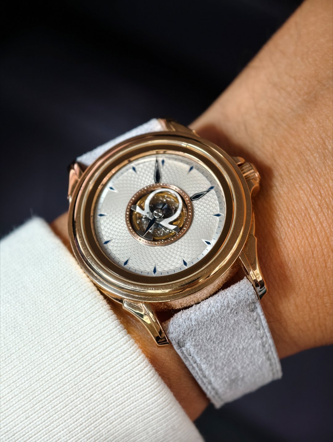 有史以来第一款中置陀飞轮,1994年欧米茄的开山立派之作,后续所有的中置陀飞轮都是由这一枚演进而来的。这也是欧米茄唯一一次在表盘上不印 logo。