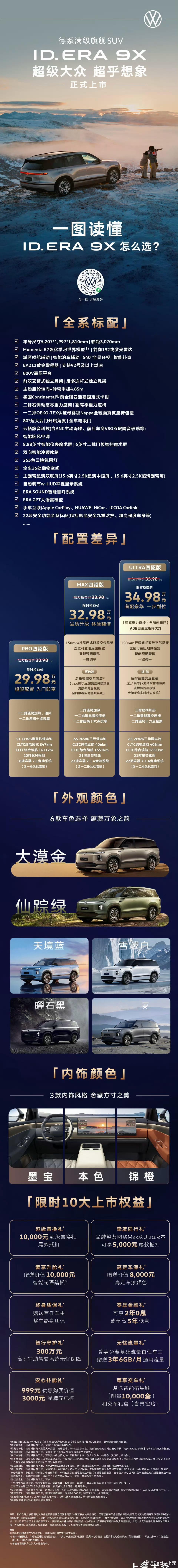 大众ID.ERA 9X上市,29.98万起,全系标配高阶智能辅助驾驶。Momenta R7强化学习世界模型上车,智驾这块算是坐进牌桌了;5米多的车长靠后轮10度转向把转弯半径压到4.85米,城市掉头比想象中轻松。一小时锁单破万,确实很有实力