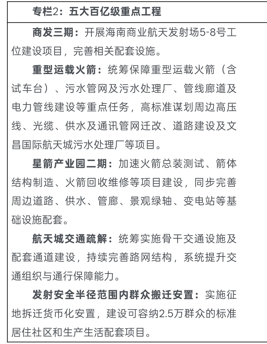 根据《文昌市人民政府关于印发文昌市国民经济和社会发展第十五个五年规划纲要的通知 》显示;第十五个五年,文昌服务保障“长九问天”国家级战略工程,完成重型运载火箭及试车台项目征地拆迁、电力迁改、转运路和配套基础设施建设等工作。建设海南航天发射场能力提升项目,推进海南航天发射场火箭海上发射平台等项目,加快实施商发三期项目,推进5-8号工位及配套转运路、海上回收码头等项目前期工作。