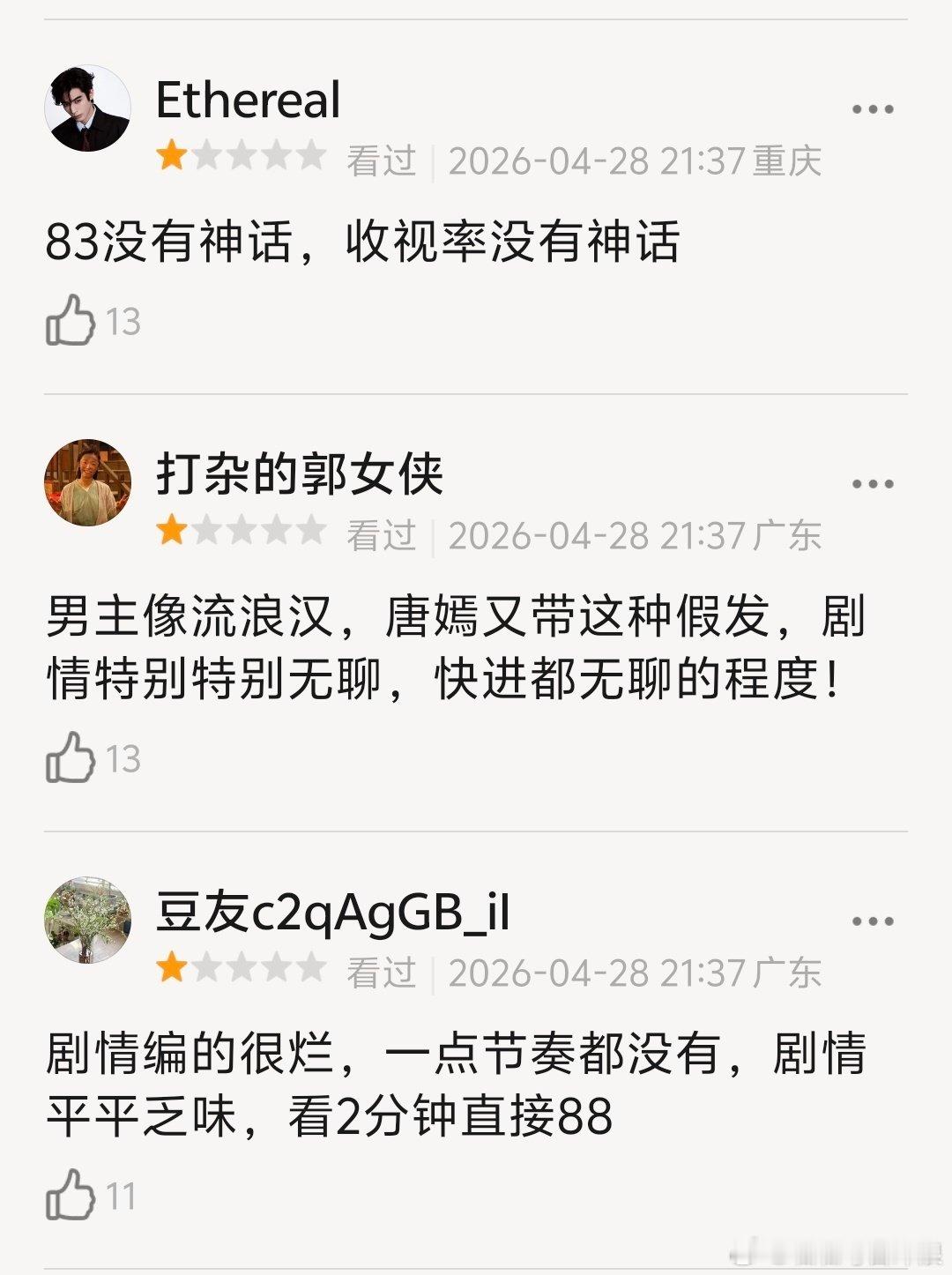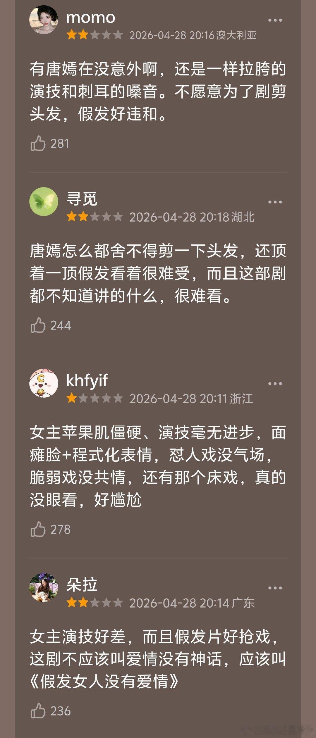 唐嫣、赵又廷《爱情没有神话》首播,受编剧秦雯影响,换档期后重新开播,结果现在豆瓣repo差评好多。唐嫣假发出戏,小油条像流浪汉,节奏剧情都很无聊。虽然央8播出,但是收视也很一般。不过也有说质感好的,你觉得如何? 爱情没有神话
