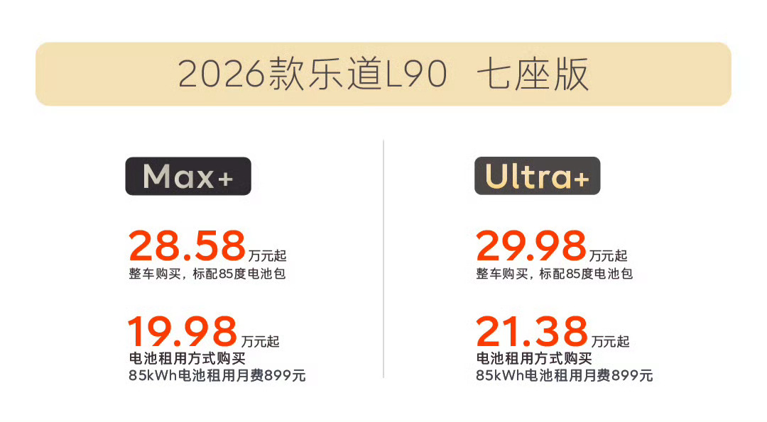 新款乐道L90七座版起售价28.58万,租电19.98万起;