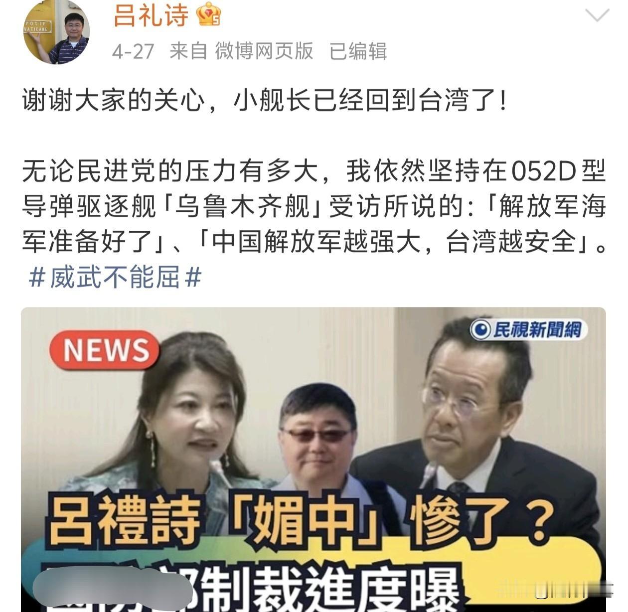 目前吕礼诗人已经回到台湾,并且已经上了节目,还在节目中大大方方的拿出他这次参观解放军军舰收到的同心结礼物,也毫不掩饰的说明这次参观解放军军舰的相关情况,并且对于民进党当局的针对表示没在怕的,向民进党当局喊话有本事就冲他自己来。