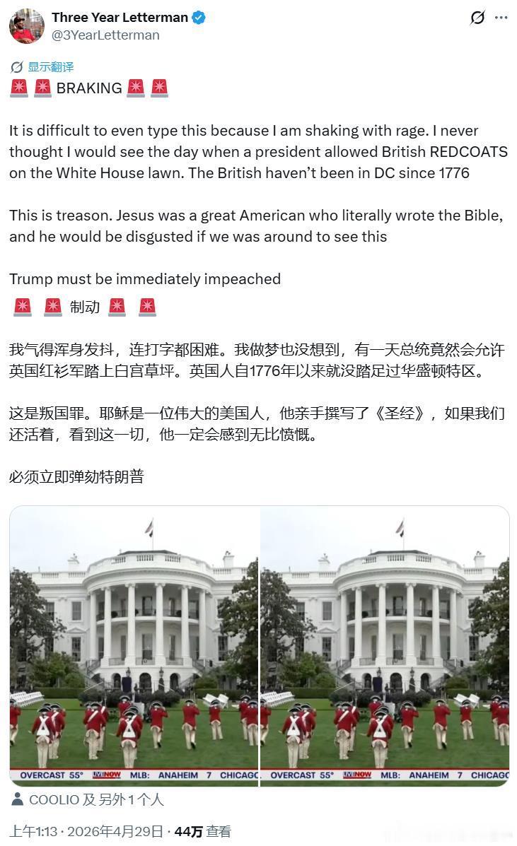愤怒的美国人:“我甚至很难把这些话打出来,因为我气得发抖。我从没想过有一天会看到一位总统允许英国“红衣军”出现在白宫草坪上。自1776年以来,英国人就再也没有进入过华盛顿特区。